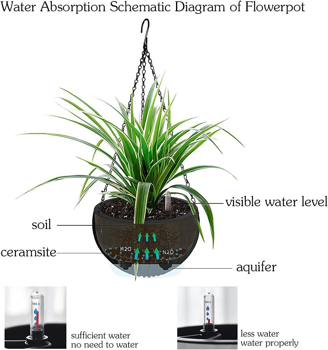 Fashion, modern design, modern home perfect match. 2 sets, to meet your different needs of planting flowers and plants. Double hanging pot and automatic watering design ensure that plants will not lack water, making plants easy to grow. a water-level indicator lets you know when it is time to refill the reservoir. Equipped with metal triangle chain, providing excellent stability and balance. It is made of high quality plastic and durable. The idea of planting flowers, grass, succulent plants, cactus, simulation plants, etc. Very suitable for hanging at home, office, garden, porch, balcony, windowsill and other places. Specifications: Item: Self watering hanging pots Color: Black Size: Diameter 8.3 inches, height 4.7 inches, chain length: 20.4 inches Number:1 Pack