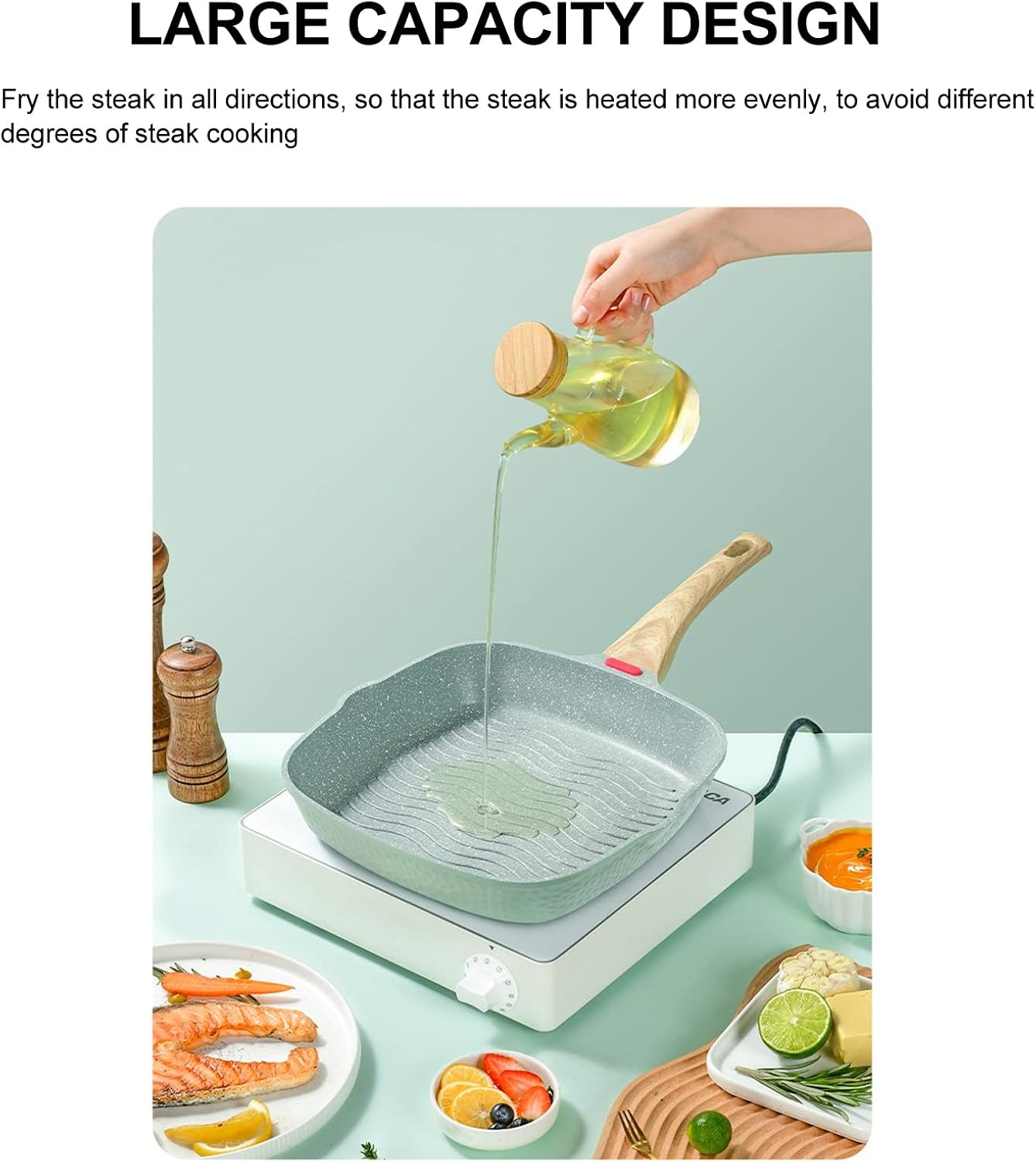 Feature: 1. Elevated Ribs: This grill pan is designed with elevated grill ribs to prevent steak from over cooking when frying steak. 2. Even Conduction: This grill skillet features large capacity, which ensures fast and even heat conduction, saving time and energy. 3. 2 Pour Spouts: This grilling pan is equipped with 2 pour spouts for easy pouroff of gravy or rendered grease. 4. PFOA Free: This nonstick and eco friendly grilling pan helps you achieve nonstick perfection while 100% free of APEO and PFOA. 5. Temperature Sensing: This steak grill pan possesses a tenperature sensing silicone pad, so the color varies with temperature. Specification: Item Type: Grill Pan Material: Aluminium Alloy, Maifanstone, Engineering Plastic, Product Size: Approx. 28 x 28 x 5.5 x 18cm / 11.02 x 11.02 x 2.17 x 7.09in ( Manual Measurement, Slight Error May Exist ) Weight: Approx. 1213g / 42.79oz Package List: 1 x Grill Pan1 x Handle 1 x Screw