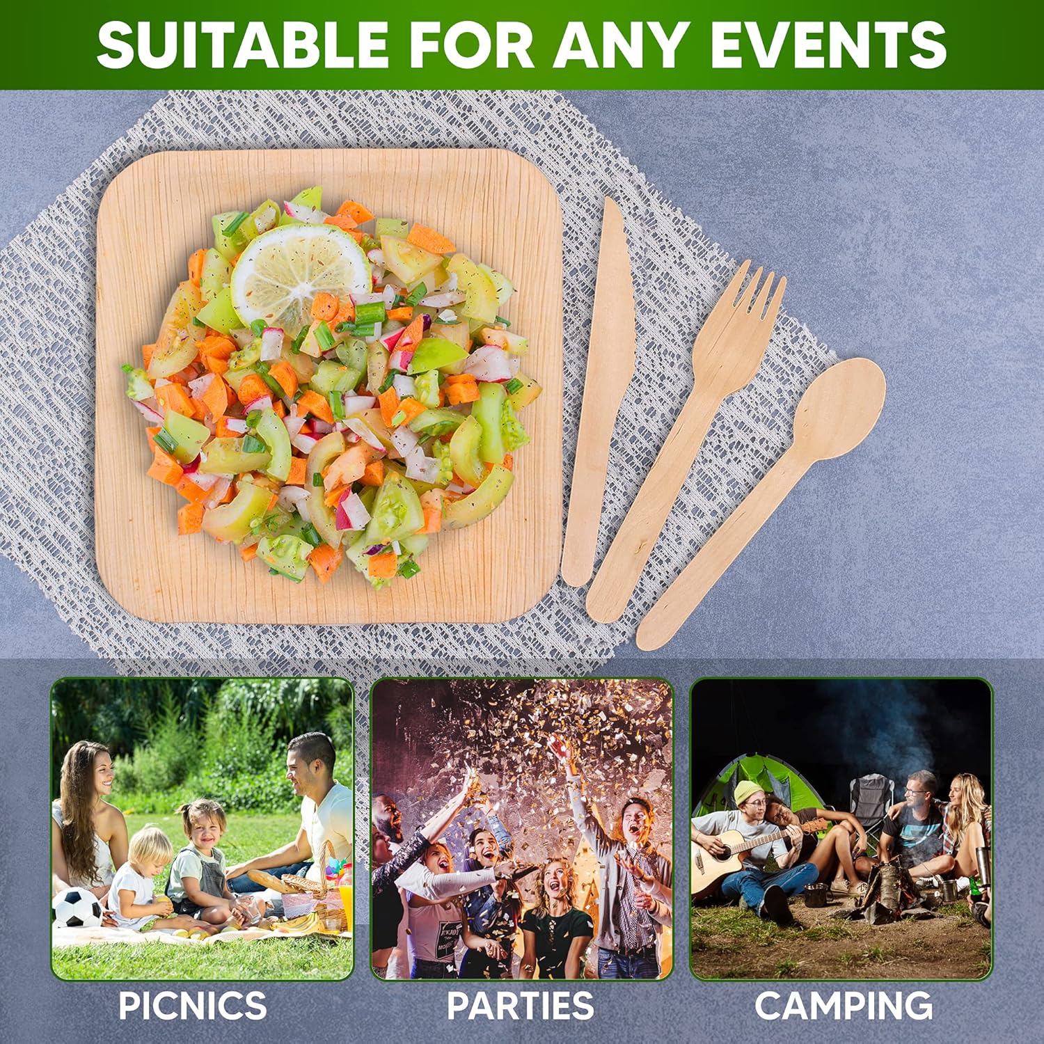 THE ULTIMATE 100-PIECE DINNERWARE - PLATES CUTLERY KIT Are you going to hold a party? And are you worried about your guests and friends having enough dinnerware? This adorable set of Plates, Cups, Spoons, Forks, and Napkins is just what you are looking for! Unlike conventional plates and cutlery, this biodegradable party supplies set provides you serving convenience and saves you on clean-up time so that you can spend more time with friends and family in your events while at the same making a bold statement on the need to care for the environment. Value Pack for 25 Guests 25x8.8” Dinner Plates 25x Spoons 25x Knives 25x Cups 25x Forks 25x Napkins Everything you need to serve 25 guests or customers in Weddings, Birthday Parties, Picnics, Camping, Lunches, Events, BBQs, Catering, and Much More. Durable, Practical, and Convenient Sturdy, and durable enough to hold and carry all kinds of food such as desserts, BBQs, salads, and main course meals. Cut resistant, oil resistant, leak-proof, and splinter-free- wont get sag or soggy while enjoying quality mealtime with guests and friends! Small, compact, and easy to take to picnics, camping, and outdoor events Microwave and Freezer Safe Natural and light-textured to create a smooth eating surface for an enjoyable dining experience Zero Burden on The Environment Made from 100% natural plant-based materials, our tableware set is biodegradable and compostable. Will naturally degrade into nutrient-rich organic materials. Dispose them of WITHOUT the guilt associated with disposing of plastic dinnerware. Why wait? Click Add to Cart NOW! Impress Your Guests, Friends, and Customer with This Earth-Conscious Dinnerware!