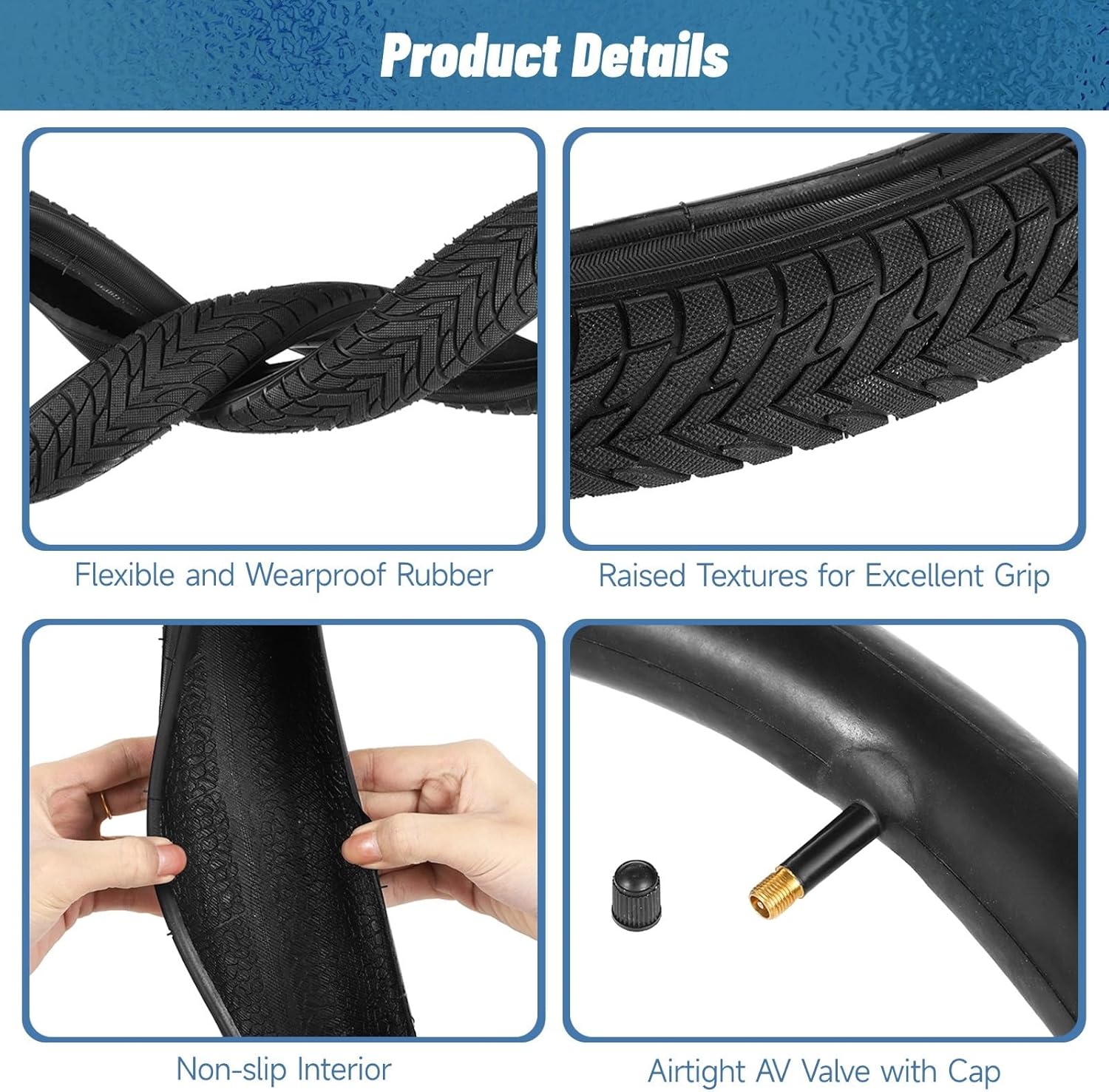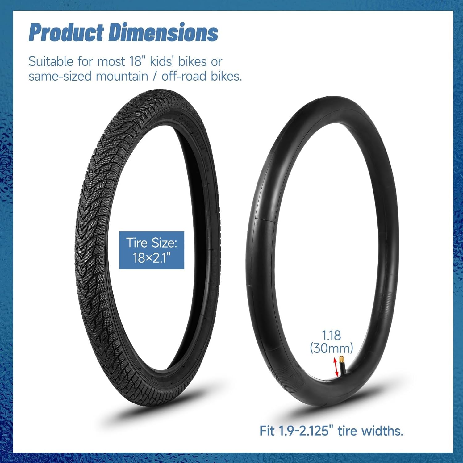 Color: blackMaterial: rubberSize: 18×2.1"Package Includes: 2×bike tire, 2×inner tube, 2×tire lever, 1×tire repair file, 8×patch, 2×small rubber tube, 1×user manual, 1×storage boxNote:- Please refer to the measurement. Tiny measuring error is allowable in normal range.- There might be a little color difference due to the monitor, camera or other factors, please refer to the physical item.Package Including2×bike tire, 2×inner tube, 2×tire lever, 1×tire repair file, 8×patch, 2×small rubber tube, 1×user manual, 1×storage box