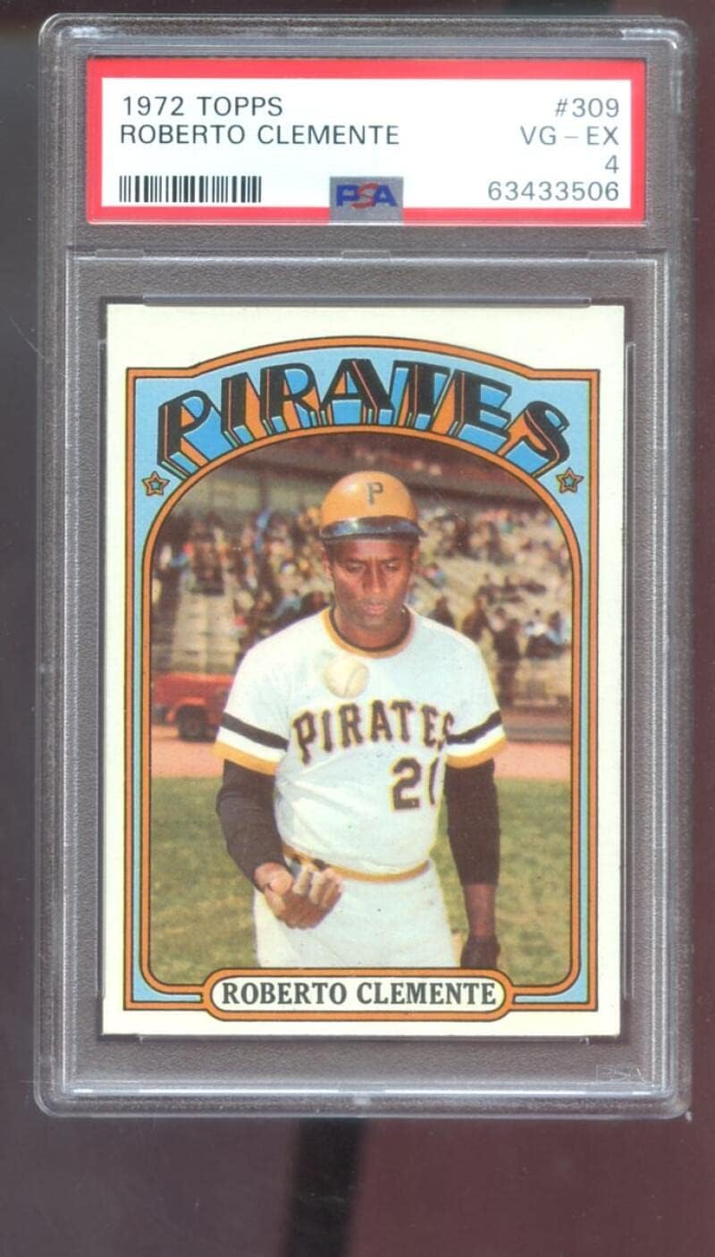 1972 Topps #309 Roberto Clemente PSA 4 Graded Baseball Card Pittsburgh Pirates. This listing is for a 1972 Topps #309 Roberto Clemente MLB Graded Baseball Card graded by PSA as a PSA VG-EX 4. The card is shown in the first scan. The back of the card is shown in the second scan. Great card!
