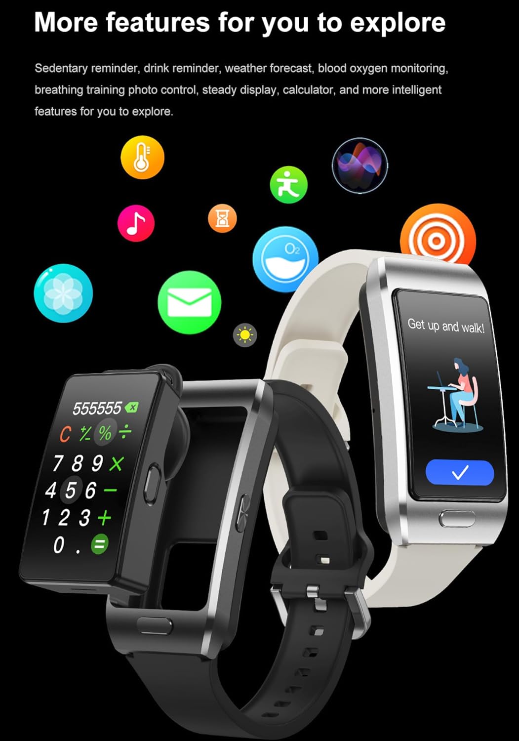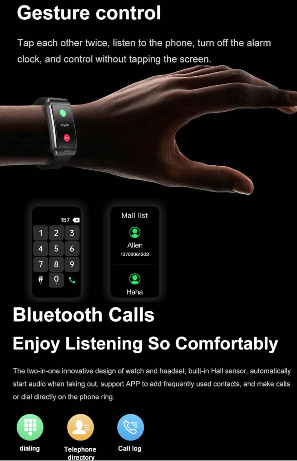 Fitness watch : LCD Hd:1.57 Large screen 200×320 TP:Full touch arc full fit RAM:RAM: 672KB Extended FLASH ROM:64Mb 1button: Switch button ➕ return button Bluetooth:3.0 and 5.1BLE SPK amplifier:Class A/B 0.8W Magnetic suction charging Battery Capacity:190mAh Language17:Chinese, English (default) Turkish, Hebrew, Arabicetc. Health:Step counting, walking, running, football, badminton, tennis, basketball, table tennis, cycling, climbing, skipping rope, yoga QR code addition Information push facebook、twitter、whatsapp Siri voice assistant,Dual mode Custom watch face ,APP dial library:500+ calculator , Music player Sedentary, drink water reminder sleep。calendar,Alarm clock,call settings,timer,stopwatch ,game breathe ather,Password lock screen function, find phone Support for third-party weather ,Split screen UI new function 1. Zanzhu, worship the alarm clock 2. Independent time; 3. Independent alarm clock 4. Lock wallpaper (update) 5. Swipe down,slide and SOS 6. The function of the dial pointer is always on 7. The function of uniform rotation of the dial pointer 8. Charging horizontal and vertical screen 9. Language selection interface 10. Women's health 11. Call switching function 12. Reminder of taking medicine 13. QR code push, GPS track, Bluetooth one-click connection 14. The latest task bar 15. TP cover the breath screen function 16. Encoder vibration switch 17. Watch face preview function 18. Lingdong Island 19. Wooden fish 20. Pull up and down semi-transparent effect 21. Lyrics synchronisation