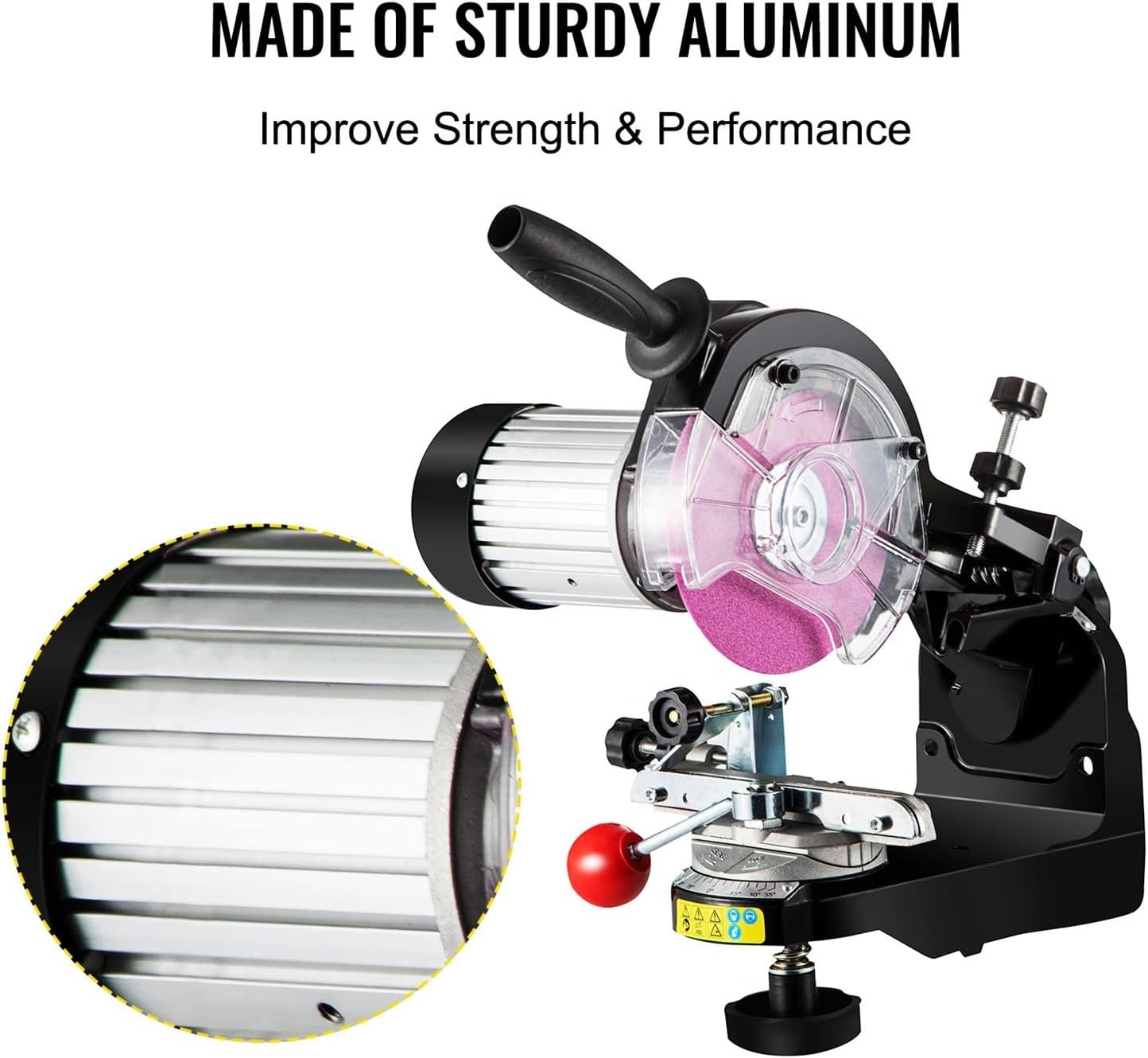 SpecificationsMaterial: AluminumVoltage: 110V±15%, 60HzPower: 230 W(Peak 350 W)Maximum speed: 3000 RPMWeight: 12.8 lbsNoise level: 85dB(A)Grinding Diameter: 5.5"/13.97 cmArbor Size: 0.875"Protection: IP20Sharpens chain pitch: 1/4", 3/8" Low Pro, 0.325", 3/8", 0.404"Package Content1 x Chainsaw Chain SharpenerFeatures & DetailsSTURDY ALUMINUM MATERIAL This kind of chainsaw sharpener is made of highquality aluminum material which gives it the qualities of anti-ruse and scratch-proof. Moreover, the aluminum structure improves its strength and performance.WORKING LIGHT & PROTECTION There is a working light mounted on the chain sharpener chainsaw for lighting while you are using it in a dark place The antislid handle also helps hold the machine tightly for protection3000 RPM MOTOR- The motor of the chainsaw chain sharpener is a commercial motor of 3000 RPM. It will make sure that your chains will not be burned or soften mistakenly.TILTING VISE & GRINDING WHEELS The tilting vise on the chainsaw sharpeners are suitable for semichisel chisel style cutters And the 55 large grinding wheels can help you sharpen the chain more efficientlyWIDE APPLICATION- The chainsaw electric sharpener is widely used in your house or your working fields to polish and sharpen your items. The angle can be adjusted for your needs. It is applicable for chains of 1/4", 0.325", 3/8", and 0.404" pitch.