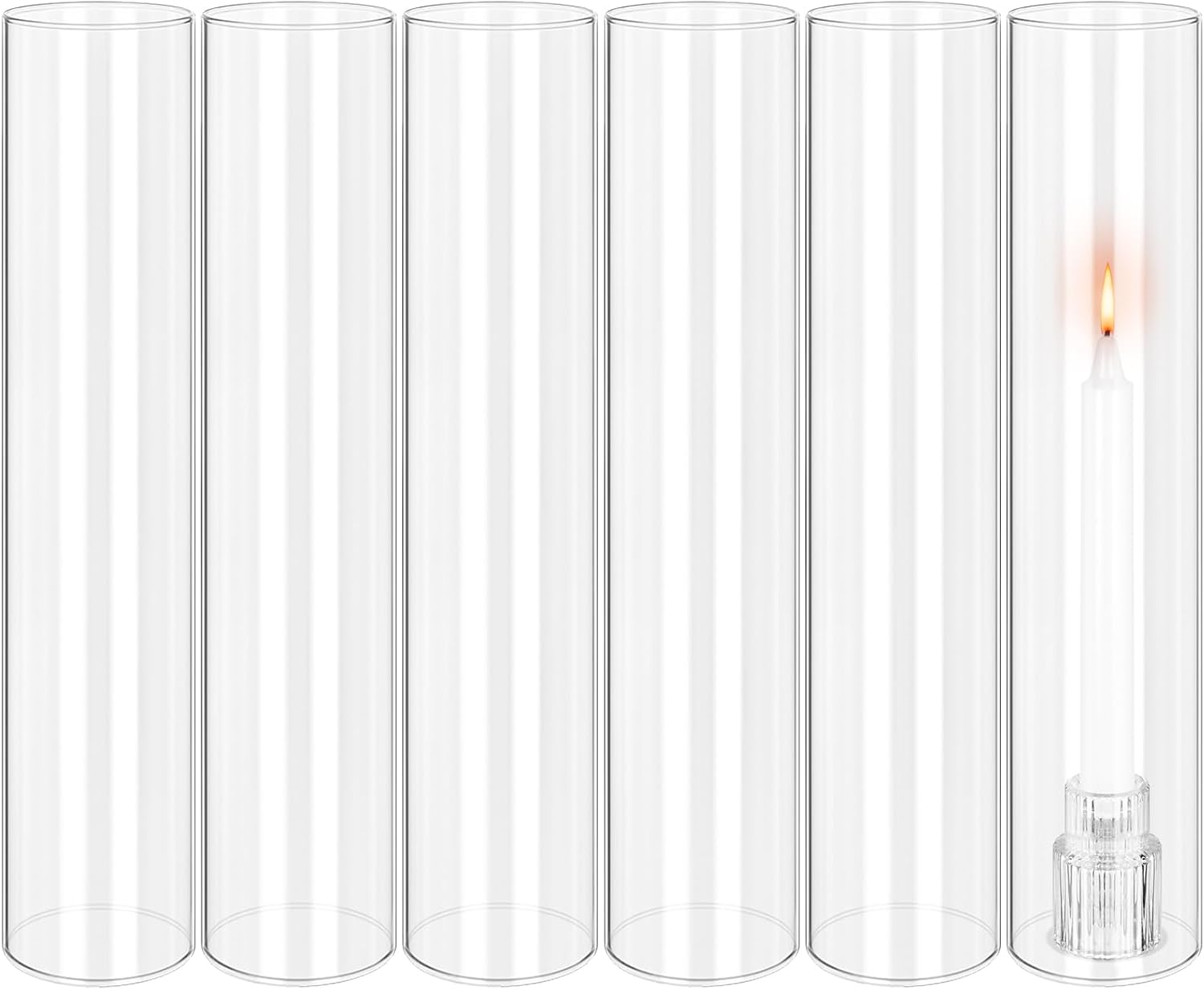 Product Description:Hurricane Candle Holder Features:1. Our Hurricane Candle Holder are tubular in shape, Open Both Ends, No bottom.Hurricane chimney is like a hollow glass tube, you can just place them on your candles, simple and easy, saving your time and energy. An open ended candleholder for pillar candles or taper candles, bottomless cylindrical glass shield for open flame candles, easy to place over lit candles, can bring a nice protection to an open flame candle.2. The hurricane clear candle holder is made of strong borosilicate glass with high polished surface, safe and sturdy, not easy to break or deform. The edges of the glass are finely cut and polished without scratching your hands. Easy to place over lit candles. Allows a mess-free candle lighting experience. Glass Candle Holder Sets are the most simple, elegant centerpieces. They are the effective decor for almost all occasions.3. Our clear glass chimney candle holder are the perfect centerpiece decorations for weddings, birthday parties, Christmas, and Thanksgiving festival party or Halloween festivals, not only can cover open flames and keep the wind out, but also can increase the romantic atmosphere of the room; This glass tube candle holder can be widely used for many candlesticks, sconces, lamp bulbs, wedding displays, lantern fixtures, wall lamps, at your wedding, birthday, candlelight dinner and other indoor and outdoor occasions.Specification:Quantity: 24 PCSMaterial: Strong borosilicate glass.Size: Diameter:2.5"(65mm), Height:14"(350mm)Pattern: Romantic & VintageColor: TransparentSafety Tips:1. Due to the current strict open flame policy, many events are prohibited to use open flame devices, this candle holder can bring you decorative effects at the same time can also cover the open flame well, ensuring the safety of use.2. The hurricane clear candle holder is made of strong borosilicate glass with high polished surface, safe and sturdy, not easy to break or deform. The edges of the glass are finely cut and polished without scratching your hands.3. Our borosilicate glass chimney is well packed, these products will not break easily. In case received broken, we will offer replacement or refund.Our Service:24hours online customer serviceIf You're not completely satisfied with your purchase simply let us knowWe will help you solve your problem well.Notes:Manual measurement, please allow slight size error.Colors may vary slightly due to different screen displays.