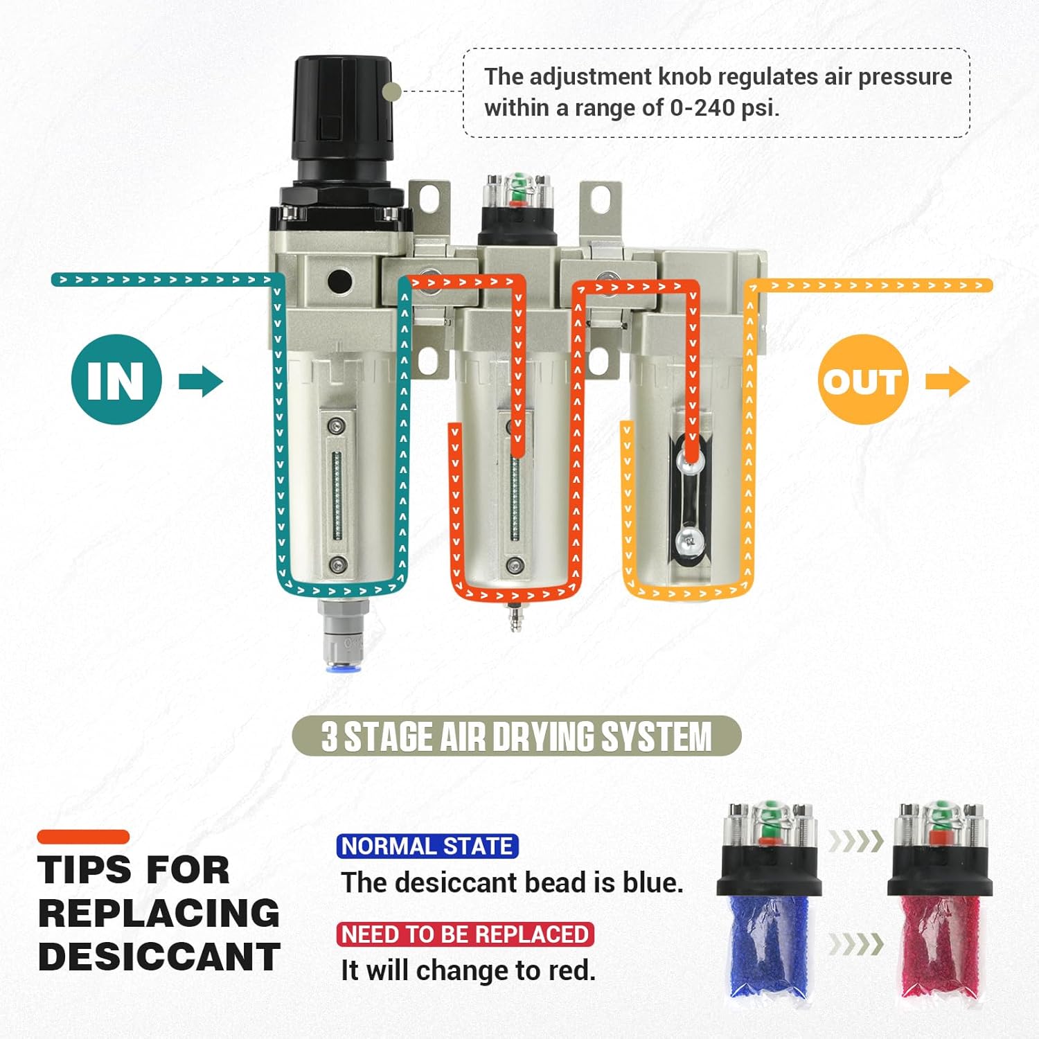 | Included Components | air connectors, pipe fittings, replacement filter elements, desiccant beads, thread seal tape, pressure gauge |