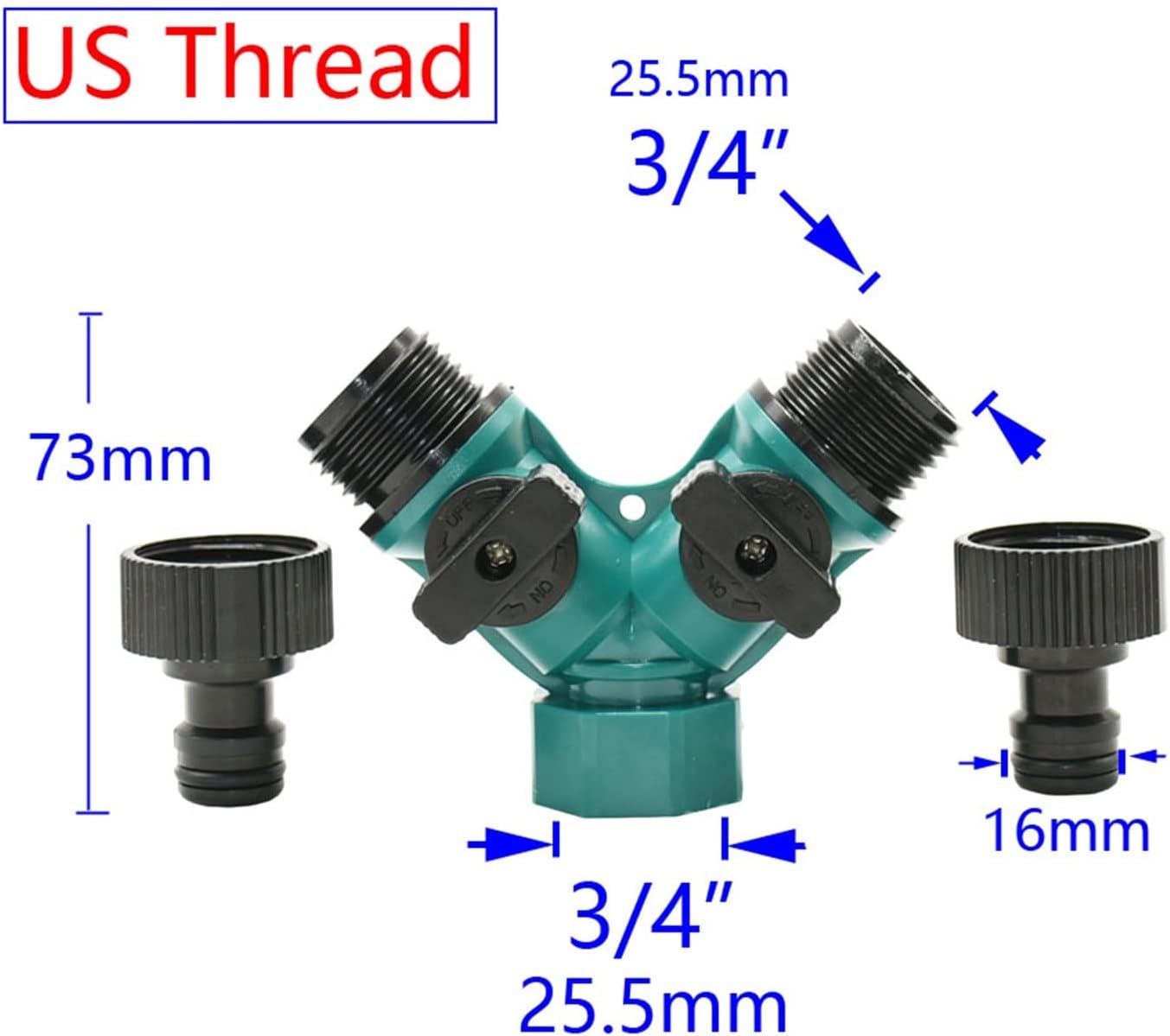 Downspouts3/4 Thread 2-Way Garden Tap Hose Splitter Y Type With Nipple Quick Connector Irrigation Valve Garden Water Adapter 20PcsA merican standard thread 3/4 inch3/4 inch thread: about 25.5mm in diameterConnection thread: 3/4 inchNipple connector = about 16mmRemovable, using 3/4 US standard threadPacking quantity: 20PcsCompatible with international standard connectors, suitable for your quick connectors,Flowers, plants, lawns, agriculture, villas, easy to install,The independent valve can be closed, strong and durable,Long service life, well recognized by users.The product dimension drawing is manually measured,There may be an error of 1-2 mm.