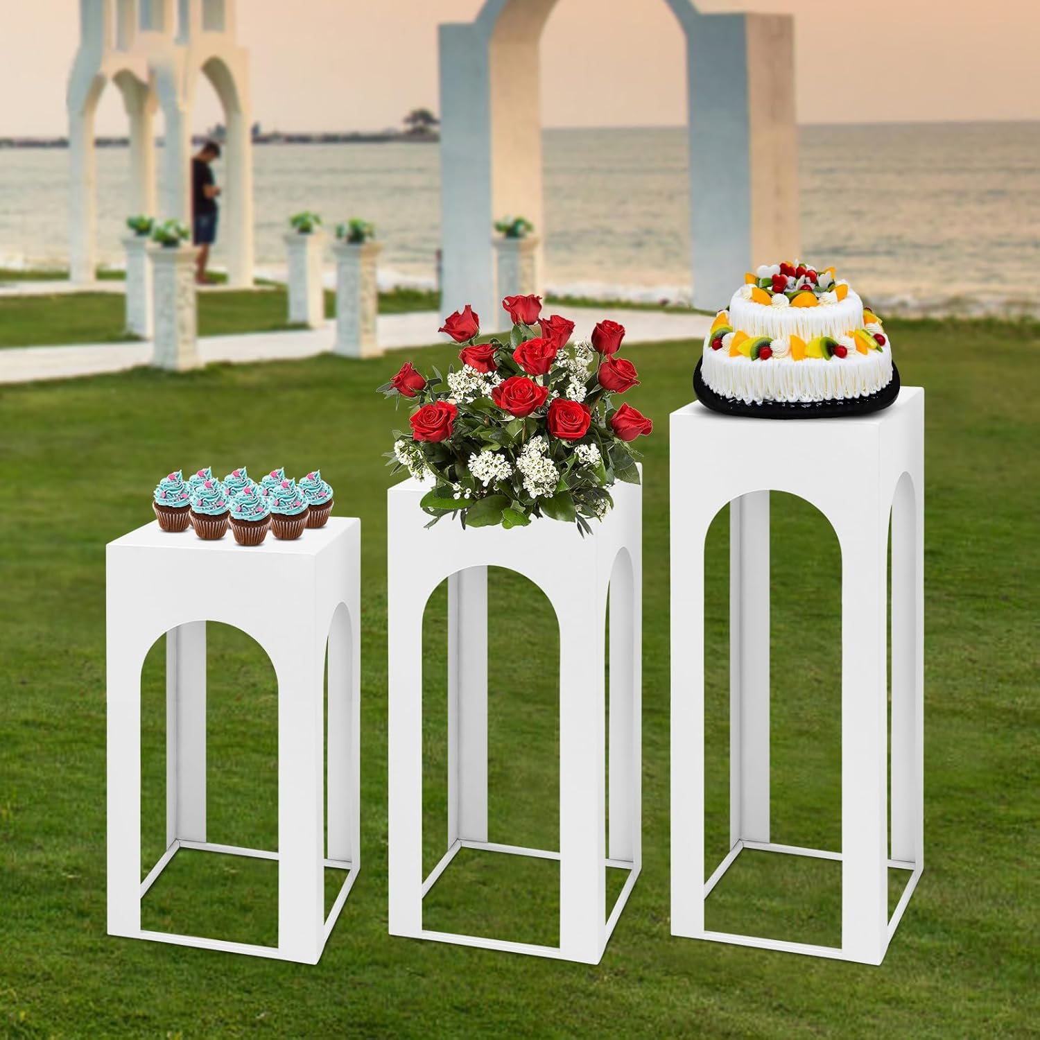 Description:Crafted from premium iron, this three-piece set of display pedestal stands features a robust construction and a pure white finish that elegantly accentuates your displays. Meticulously designed to be both durable and versatile, its minimalist style adapts to home decor, school events, festivals, wedding celebrations, and more—adding a touch of refined simplicity to your significant occasion.Features:Built to Last: The premium iron with the baking paint process makes these products stand up to corrosion, rust, and deformation, ensuring stable performance and a long service life.3 Pieces a Set: With three different sizes of products, the set allows for organized arrangements or separate placement across multiple locations to suit your decorative needs.Ready to Use: Without assembly requirements, you can simply wipe it clean and use it directly, offering instant convenience.Easy to Store: The stackable design makes storage convenient, significantly reducing the space required.Wide Platform: The spacious platform provides a stable footing for items of different sizes, preventing slips and falls.Smooth Edges: They are smooth to the touch and can prevent your hands and skin from getting scratched during daily use.Specifications:Color: WhiteMaterial: IronMaterial: IronProcess: Baking PaintMount Type: Free StandingAssembly Required: NoEach Load Bearing Capacity: About 10kg/22lbsProduct Size: 35*35*90cm/13.78*13.78*35.43in, 32*32*75cm/12.6*12.6*29.53in, 29*29*65cm/11.42*11.42*25.59inPackage Size: 92*37*37cm/36.22*14.57*14.57inGross Weight: 15kg/33.07lbsNet Weight: 14.25kg/31.42lbsPackage Included:3* Display Pedestal StandsNotes:1. Please check the size carefully before ordering.2. Please use the product within its load-bearing capacity.