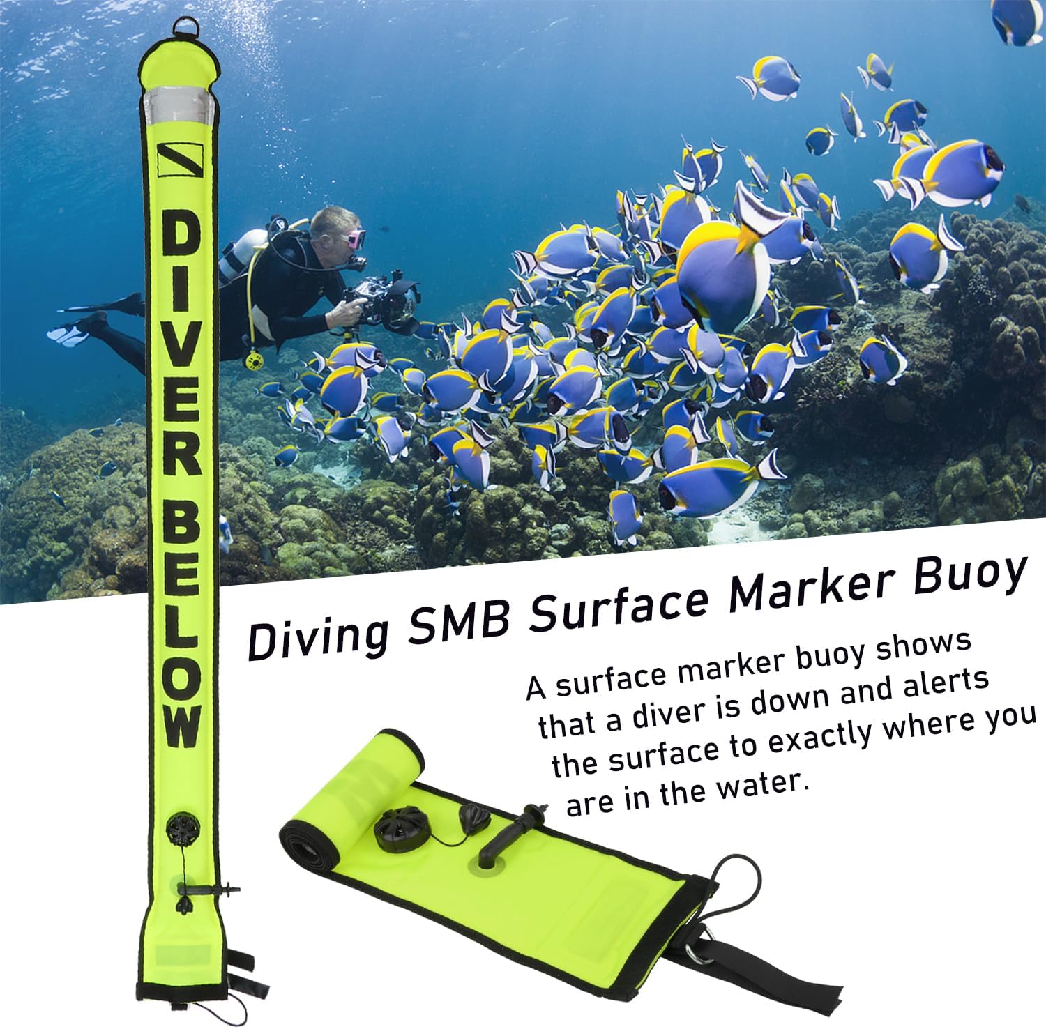 The scuba surface marker buoys with a big over-pressure valve, it can rapidly remove air when needed and eliminate accidental over-inflation during ascent from expansion, preventing the SMB from bursting.