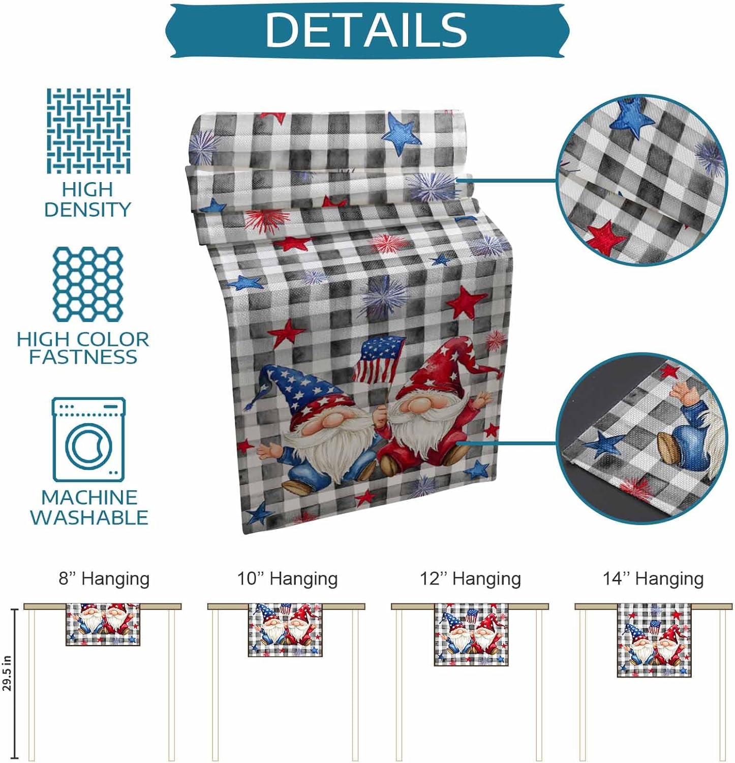 Patriotic 4th of July Table Runner for Independence Day Memorial Day Holiday Party Seasonal Indoor Outdoor Dining TableProduct DescriptionProduct Dimensions:rectangle table runner 13x36 13x48 13x60 13x72 13x90 13x108 13x120 inchesDesign Description: One side printMatches delicately and creates a unique style for your dining room, kitchen, party, banquet, hotel, diner, coffee, picnic, BBQ, camping, outdoor and indoor use, and so on.Great choice as a considerate and delicate decoration or gift for family members, friends, and neighbors on July 4th or summer theme dinner table.High Quality MaterialAdopting advanced digital printing technology, bright colors and clear images, smooth lines, overall elegant and beautiful.reusable soft material could protect your table from scratching of knives and forks, you would no longer have to worry about scratches on your favorite table.Multiple Occasions DesignOur table runners come in a variety of vibrant color patterns for each season and occasion. Give your space a real personality, the perfect gift for various seasonal holidays.Colorfast dye presents a tremendously vivid and exquisite design. It creates a wonderful holiday feature-themed party for your family and friends to enjoy together.ReminderSpecial Note: Both machine and hand washable with gentle cycle and lay flat to dry, no bleach, iron on low heat if required.Please measure your table prior to purchasing to ensure the best fit.Because the monitor display and lighting effects are different, the color of the picture color is somewhat different from the actual color.