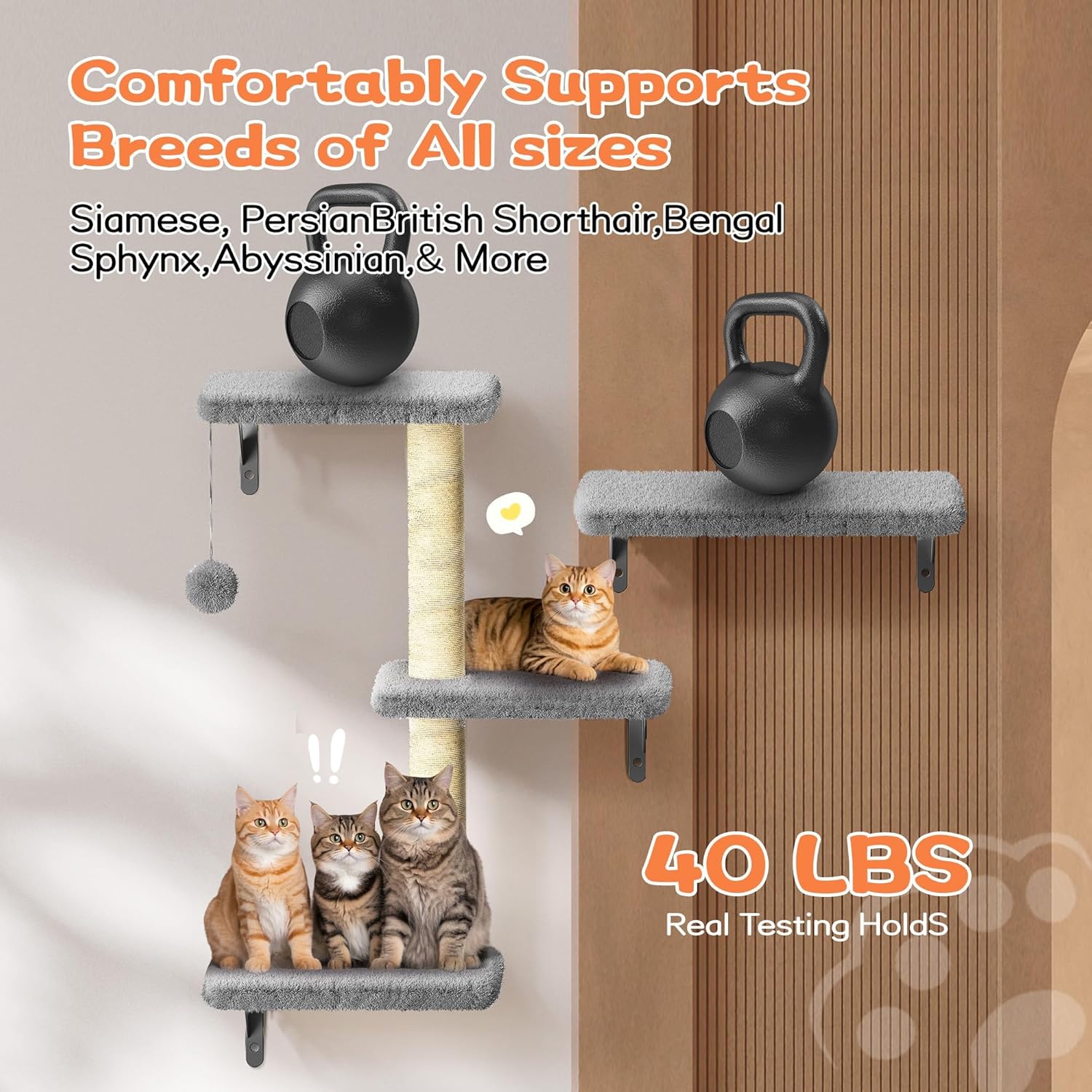 6 in 1 Cat Wall Shelves for Large Cats, Stable & Safe Kitty Walls Furniture Set for 40LBS Cats with Wooden Cat Climber,House, Bridge, Tree, Steps, and Scratcher for 16 Inch Drywall