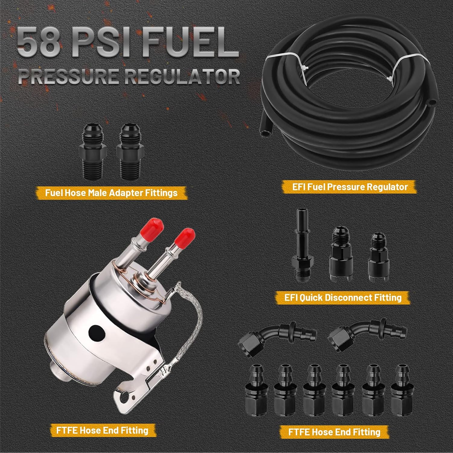 | Included Components | 1 X LS fuel filter/58psi regulator/1 X 6AN 25 feet of high-pressure fuel injection hose/1 X 6AN to 3/8" Male Straight Filter Fittings/1 X 6AN to 5/16" Fuel Filter Return Line Fitting, 2 X 6AN to 3/8" Fuel Filter Feed Line Fittings/2 X 6AN to 1/4" NPT Fuel Pump Adapters/2 X 45 Degree -6AN Female to 3/8" Push Lock hose fittings, 6 X Straight -6AN Female to 3/8" Push Lock hose fittings |