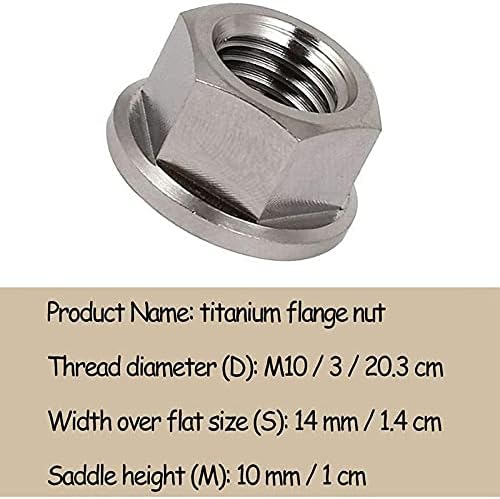 Thread diameter (D): M10 / 3 / 20.3 cmWidth over flat size (S): 14 mm / 1.4 cmSaddle height (M): 10 mm / 1 cmThread pitch: 1.25 mmFlange diameter (DC): 18 mm / 1.8 cmProduct Name: titanium flange nutColour: silverMaterial: titanium alloyPackage includes:2 /6pcs titanium flange nutOnly the above package content, other products are not included.Note: Light shooting and different displays may cause the color of the item in the picture a little different from the real thing. The measurement allowed error is +/- 1-3cm.Item specifics:Diy supplies: WoodworkingCertification: NONEOrigin: Mainland China