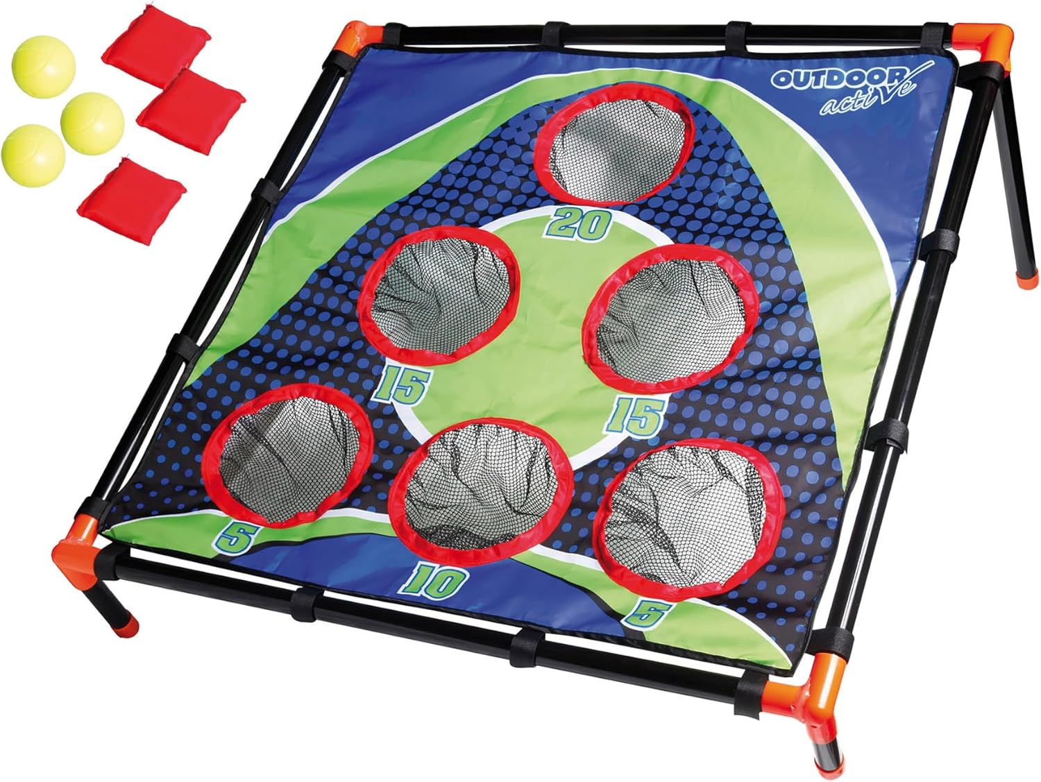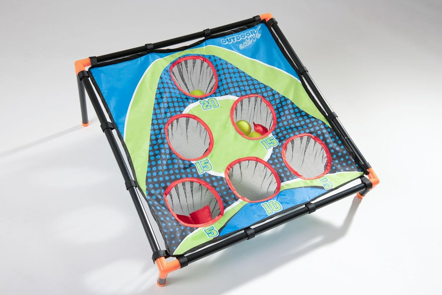 Outdoor active Toss Game Plastic Throwing Game A skill game for 2 to 4 players. Contents: 3 toss bags in two different colours, 3 plastic balls and a game board. Players throw small bags or balls on the board from a long distance and try to hit the hole with the most score. Who has the most points wins. Dimensions: 59, 5x39, 5x1, 2 cm. Suitable for ages 3 years and up.