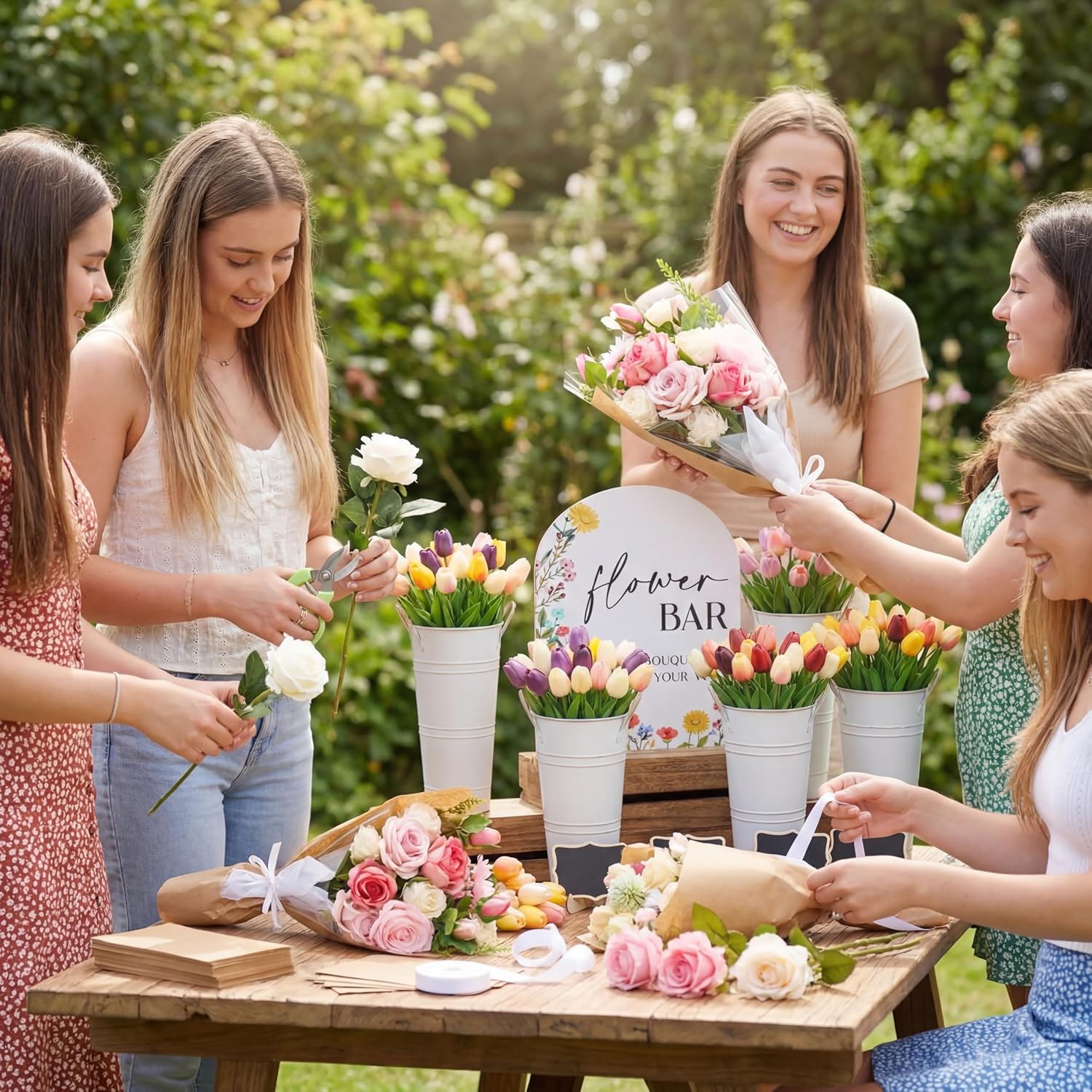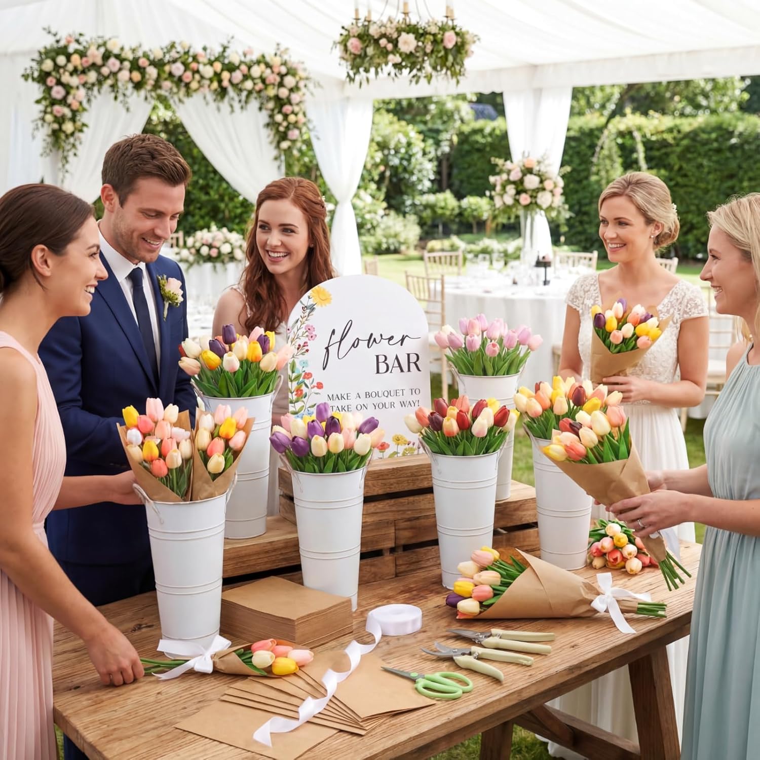 Features: Our 50 bouquet wrapping bags and white ribbons are a generous quantity to suit both everyday and business needs. Perfect for gifting flowers to your loved one on a variety of important occasions, such as Valentine's Day, dates, bridal showers, weddings, birthdays, and more. The flower bouquet bar set includes four garden shears: two straight and two curved. Made of stainless steel, they are durable enough to withstand frequent use during parties. The curved shears are suitable for trimming delicate flower stems, while the straight shears can easily and safely handle thicker stems. This flower bouquet bar set includes everything you need to set up a bar. It contains a wooden sign, flower shears, paper bags, and a metal bucket, so you don't need to buy them separately. The set includes everything guests need to create a personalized bouquet and take it home as a gift. Specifications: Material: galvanized iron, metal, paper, wood Color: multicolor Size: Galvanized bucket bars: about 10 inches Flower bouquet sign: about 7.9 x 9.4 inches White ribbon: about 1.8 cm Package includes: 6 x Galvanized bucket bars 50 x Flower bouquet wrapping papers 1 x White ribbon 1 x Flower bouquet sign 2 x Scissors 2 x Pruning shears 10 x Display boards Notes: Manual measurement, please allow slight errors on size. The color may exist a slight difference due to different screen displays. Contains sharp objects. Please handle with care