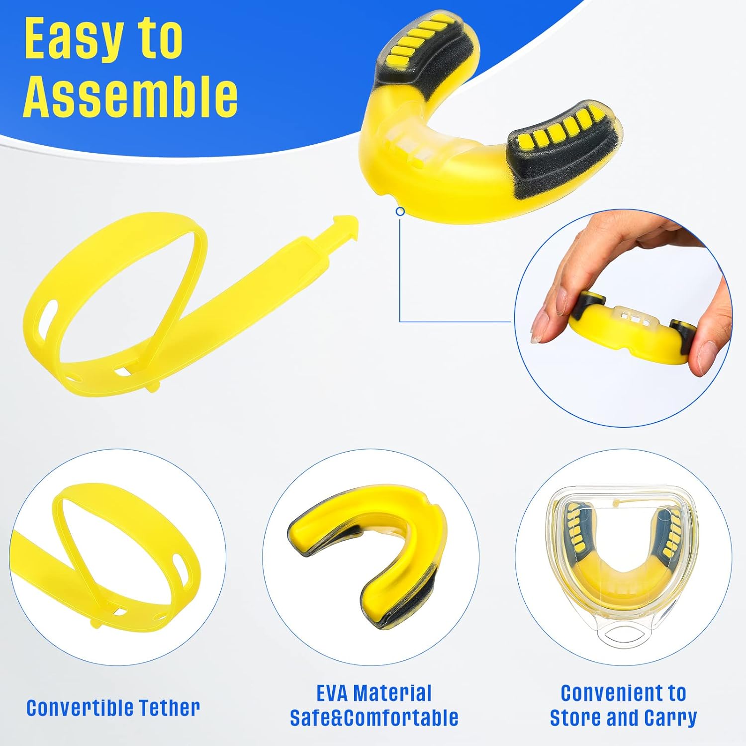 Features: The youth mouth guard for football is a practical gift for people who enjoy competitive sports, like your family members, classmates, colleagues, etc., to show your support and care for their hobbies, thus enhance your relationships. With nice workmanship and material, the boxing mouthpiece can serve you for a long time, help you fully enjoy sports activities. Specifications: Material: EVA Color: vivid colors Size: approx. 6.50 x 4.98 x 1.98 cm/ 2.56 x 1.96 x 0.78 inches Strap: approx. 18 cm/ 7.08 inches in length Package includes: 8 x Football mouth guard with strap Notes: Manual measurement, please allow slight errors on size. The color may exist a slight difference due to different screen displays. Please soak the mouthguards and rinse them in hot water before using. Please check the size carefully before ordering