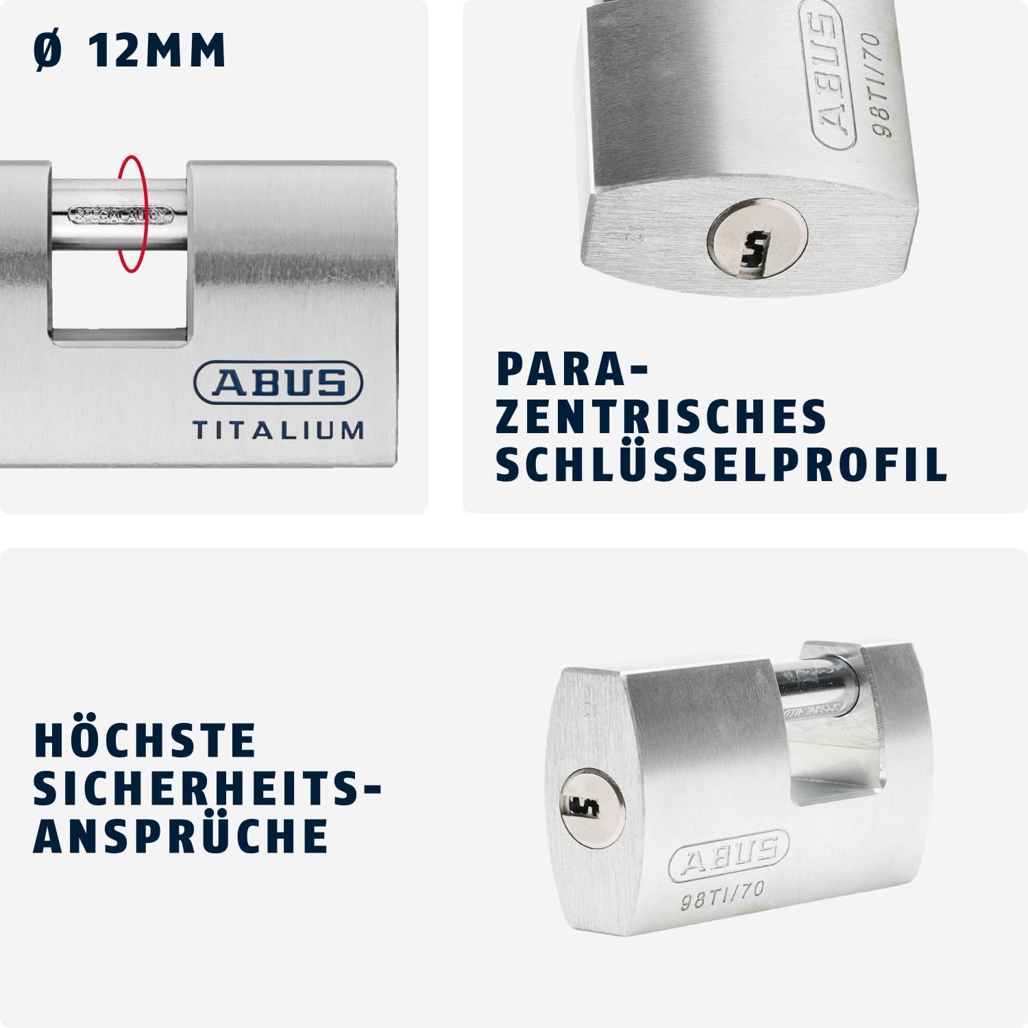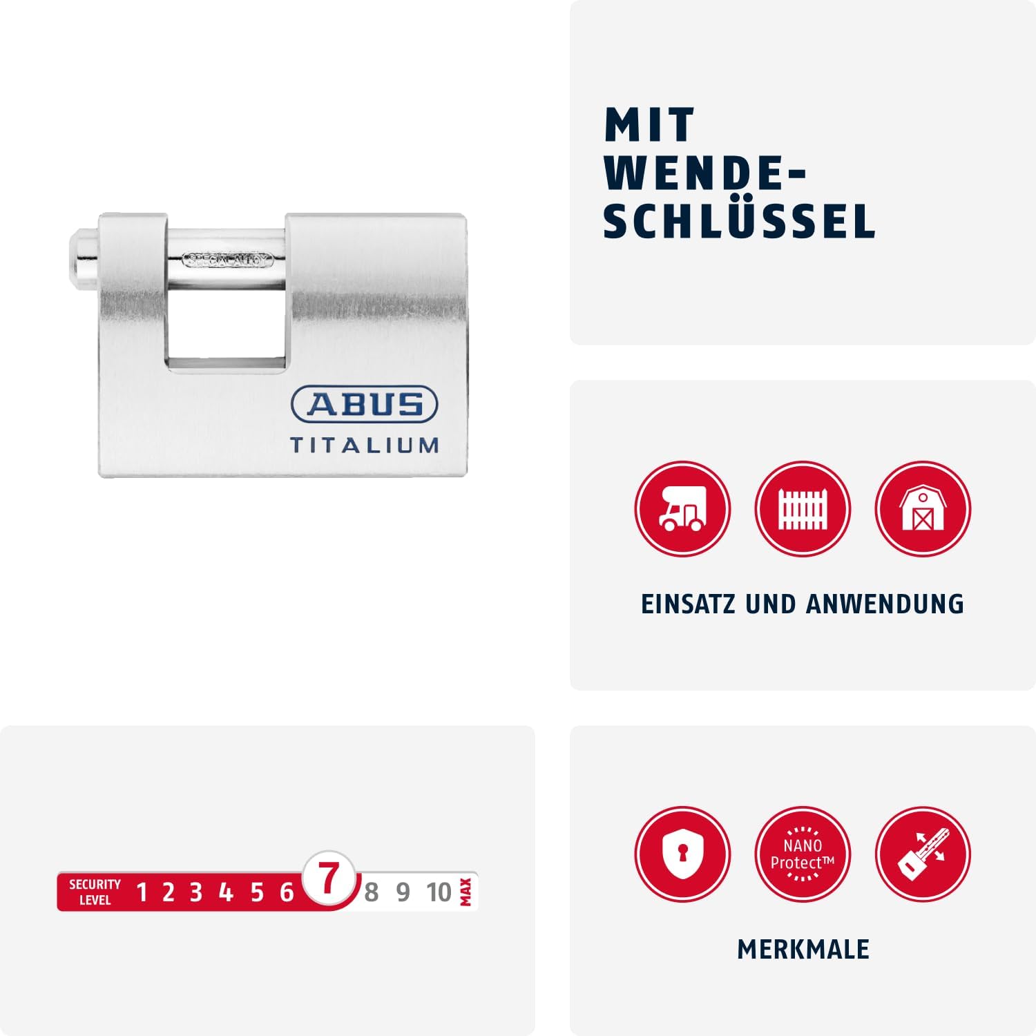 The TITALIUM padlocks of the security Expert ABUS represent a new dimension In the security of goods. Manufactured in an innovative material, they provide excellent security with a very small weight. The TITALIUM material is based on a special light aluminium alloy that stands out for its combination of strength and lightness. As in the construction of airplanes, with the TITALIUM padlocks, ABUS is committed to two essential properties: Great stability and Light weight. This product update is also reflected in its design; All the TITALIUM series padlocks convince thanks to their stainless steel appearance.
