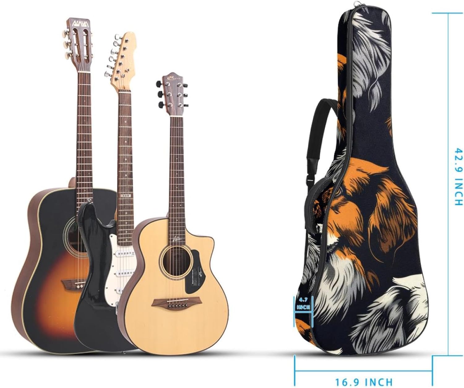 Specifications:Material: waterproof Oxford and waterproof zipper;Size: 42.9’’ x 16.9’’ x 4.7’’, perfect for 40'' 41'' 42'' guitar;Weight:36oz/1020g, lightweight;Color: Multi-color.Features:1. Adjustable backpack shoulder straps and padded side carry handle for more pleasant carrying choices.2. 10mm thick sponge padding inside provide protection for your musical instrument; and fixed Velcro above neck and body keep your acoustic guitar bag safer.3. This guitar bag comes with back hanger loop can be hung on the wall. Save more space when not in use.4. Two pockets for storage convenience, 1 large capacity pocket on outside back and 1 small pocket on the inside neck.5. Cute printed guitar gig bag guitar case backpack, ideal as a gift for your relatives or friends who love music when birthday, Thanksgiving, Christmas, holidays, and other special events.
