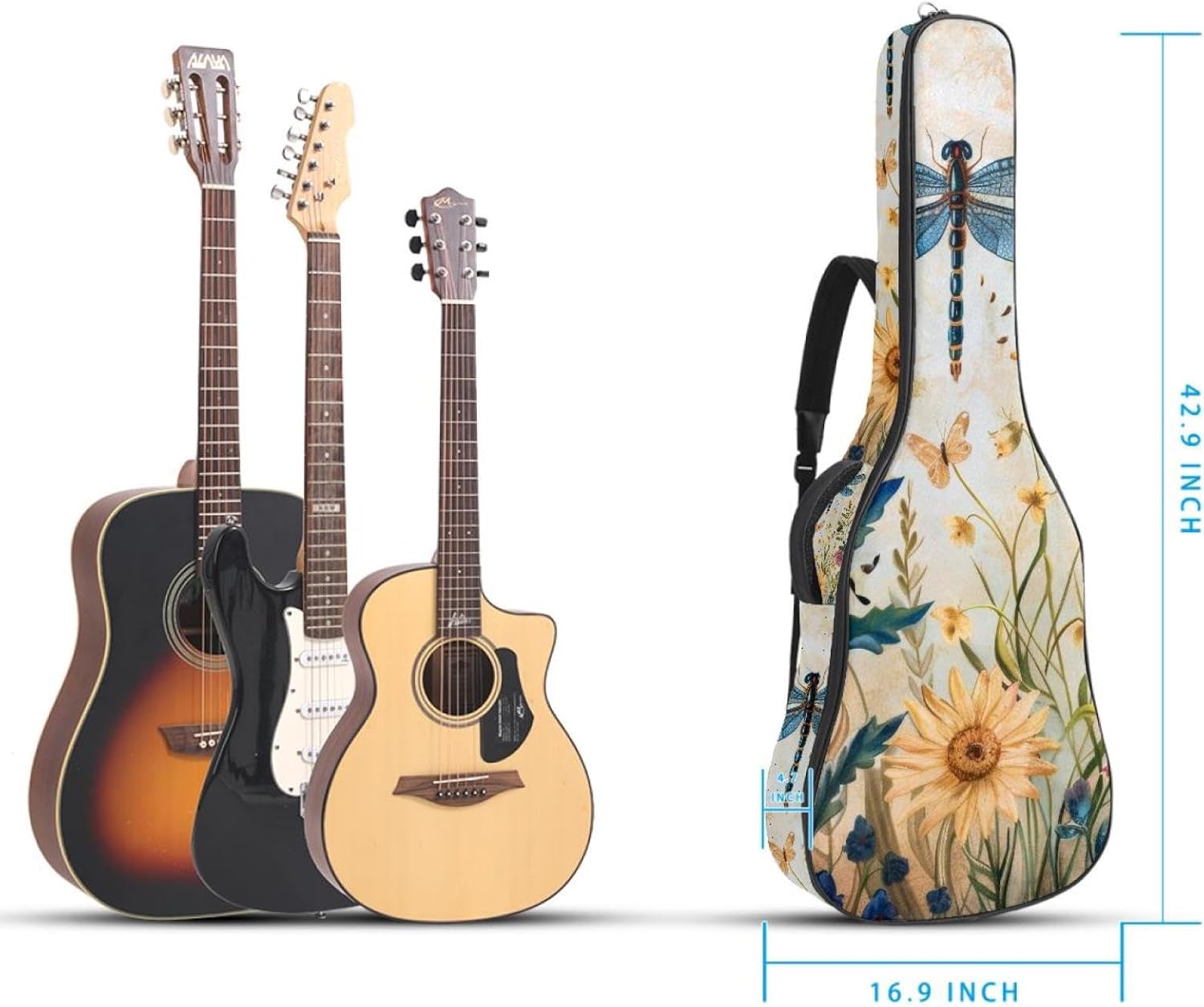 Specifications:Material: waterproof Oxford and waterproof zipper;Size: 42.9’’ x 16.9’’ x 4.7’’, perfect for 40'' 41'' 42'' guitar;Weight:36oz/1020g, lightweight;Color: Multi-color.Features:1. Adjustable backpack shoulder straps and padded side carry handle for more pleasant carrying choices.2. 10mm thick sponge padding inside provide protection for your musical instrument; and fixed Velcro above neck and body keep your acoustic guitar bag safer.3. This guitar bag comes with back hanger loop can be hung on the wall. Save more space when not in use.4. Two pockets for storage convenience, 1 large capacity pocket on outside back and 1 small pocket on the inside neck.5. Cute printed guitar gig bag guitar case backpack, ideal as a gift for your relatives or friends who love music when birthday, Thanksgiving, Christmas, holidays, and other special events.
