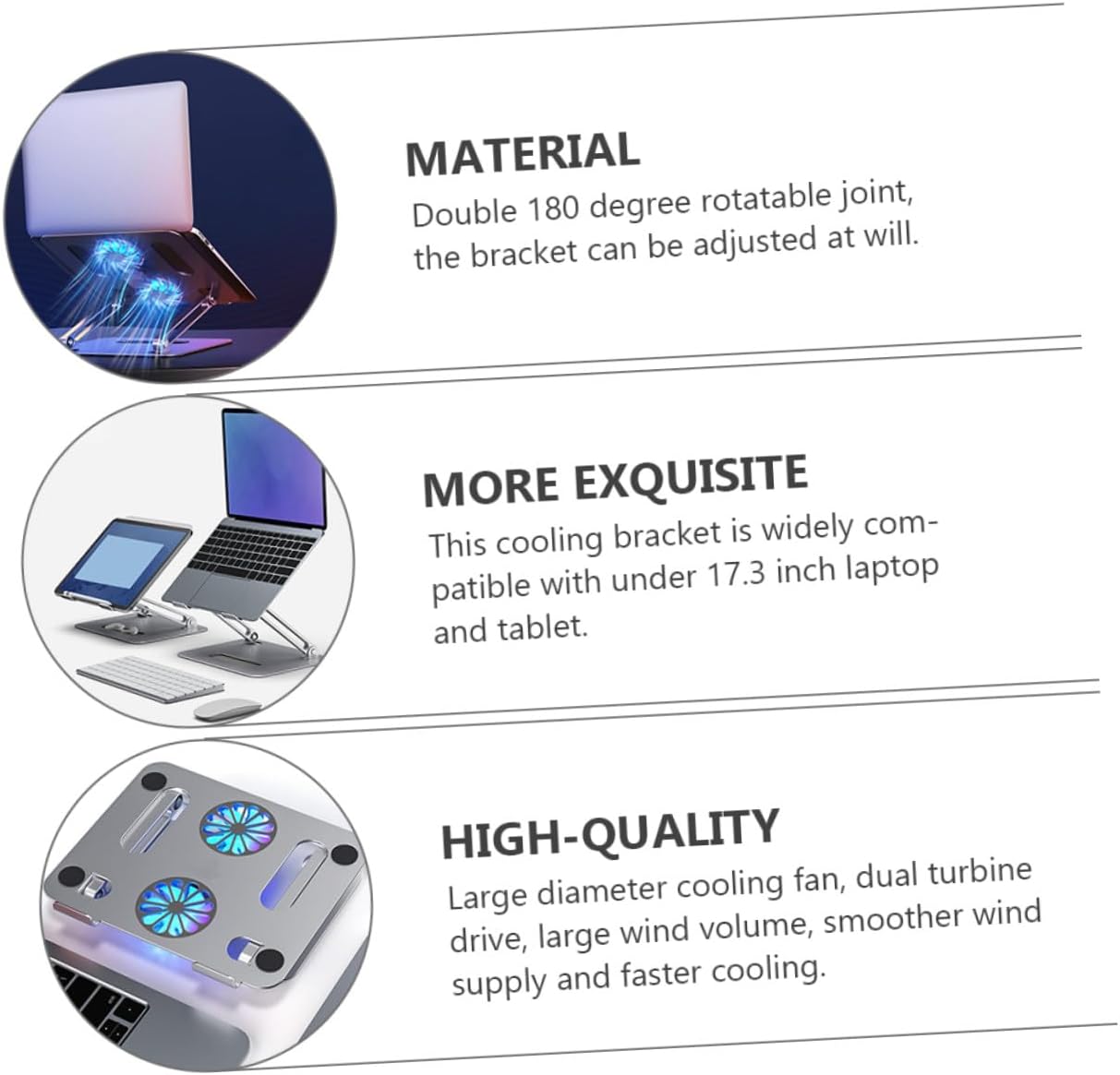 Package List 1 x laptop air cooler Features -Size: 24.90X22.00X2.70cm/9.79X8.65X1.06in -Material: aluminum alloy -Product Info:Dual fan heat sink bracket Heightening height: 0-27cm cooler laptop - aluminum alloy thickened large panel design, not easy to crack laptop cooler stand. - Increase elevation angle and cooling space, help to bring out heat from laptop with fans Alloy Laptop Stand. - Heightening working height, no need to lower your head constantly, more comfortable for your neck and back laptop Ventilated Support. - Special design and it is in fine craftsmanship. It is the best replacement for your old, broken one Laptop cooling pad. - It supports laptops under 17.3 inch, and the extremely strong metal mesh provides you with a stable surface, allowing you to work on the laptop as much as you want laptop air cooler.Goods InformationNotebook Cooler This is a very practical heightening laptop air cooler support.Cooling Pad for Laptop The craftsmanship can serve you well without breaking easily.laptop air cooler The heightening laptop air cooler support is convenient and practical, with excellent texture, and without being easily damaged