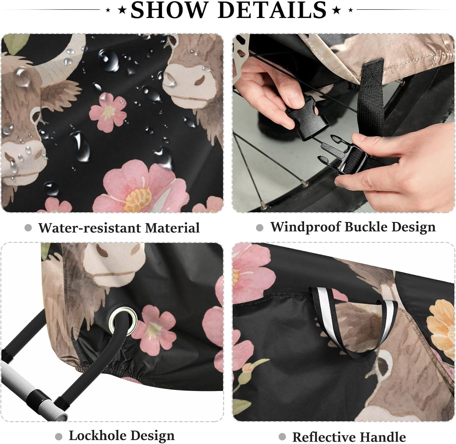 Protect your bicycle in style with our premium bike tarp, engineered for maximum defense against harsh elements. Unlike basic covers, we use specially engineered umbrella waterproof fabric - the same advanced material used in high-end rain umbrellas - delivering superior performance with unique visual appeal. Sun & Heat Defense Our fabric creates a physical cooling barrier that actively lowers your bike's temperature by: Blocking 95%+ harmful UV rays to prevent paint fading Providing exceptional shading & heat insulation (up to 20℉/11℃ reduction vs direct sun) Offering SPF 50+ equivalent protection for sensitive components Rain & Dust Protection Water-repellent coating causes rain to bead and roll off Tightly woven fabric acts as dustproof barrier for long-term storage Prevents moisture buildup with breathable side panels (prevents condensation) User-Focused Design LOCK ACCESS HOLE at front wheel enables secure locking without removing cover ADJUSTABLE BUCKLE STRAP at rear wheel anchors cover during strong winds Reflective safety strips on handles enhance nighttime visibility Ultra-lightweight (23 oz) folds into included pouch Unbeatable Aesthetics Choose from over 1,000 designer patterns - from sleek geometrics to vibrant nature motifs - transforming your bike into a street-style statement while competitors offer only solid colors.