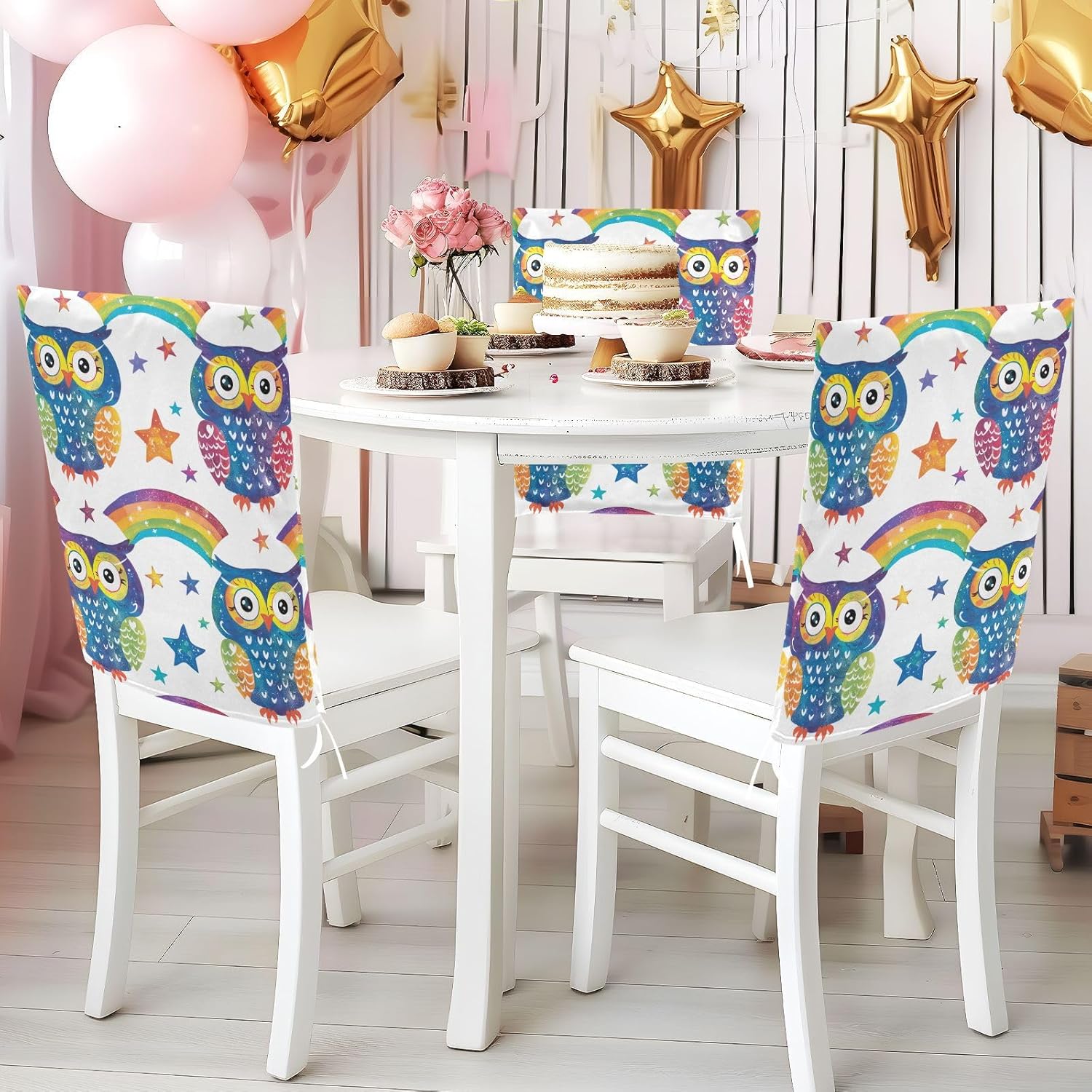 Chair Cover Material made of polyester,comfortable and soft to touch,reusable and suitable for long term use Features easy to install and remove, tie rope design at the bottom,machine washable Stylish Chair Decoration With beautiful pattern,it can be used for family party/ birthday party/wedding/ holiday party to add atmosphere, also can be used for chair decoration in living room, dorm, kitchen dining room,bedroom to bring protection to the chair while avoiding stains to dirty the chair back. Easy To Care Machine washable, Not washing with hot water, Not bleaching