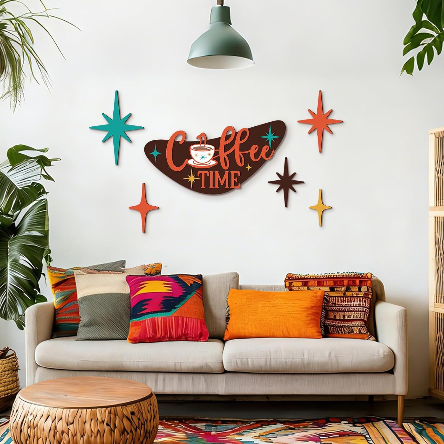Features: Add a splash of color to your interiors with this vibrant, multicolored star wall art set. Each piece is thoughtfully painted to energize your space, bringing warmth and a touch of artistic excitement. This mid century wall decor set is ideal for themed parties or events. Use it to create a starry ambiance that enriches any gathering with a welcoming and warm atmosphere. Specifications: Material: wood Color: multicolor Size: Coffee: 13.78 inches/ 35 cm Star: 9.8 inches, 7.9 inches, 5.9 inches Package includes: 6 x Mid century modern decor Notes: Manual measurement, please allow slight errors on size. The color may exist a slight difference due to different screen displays