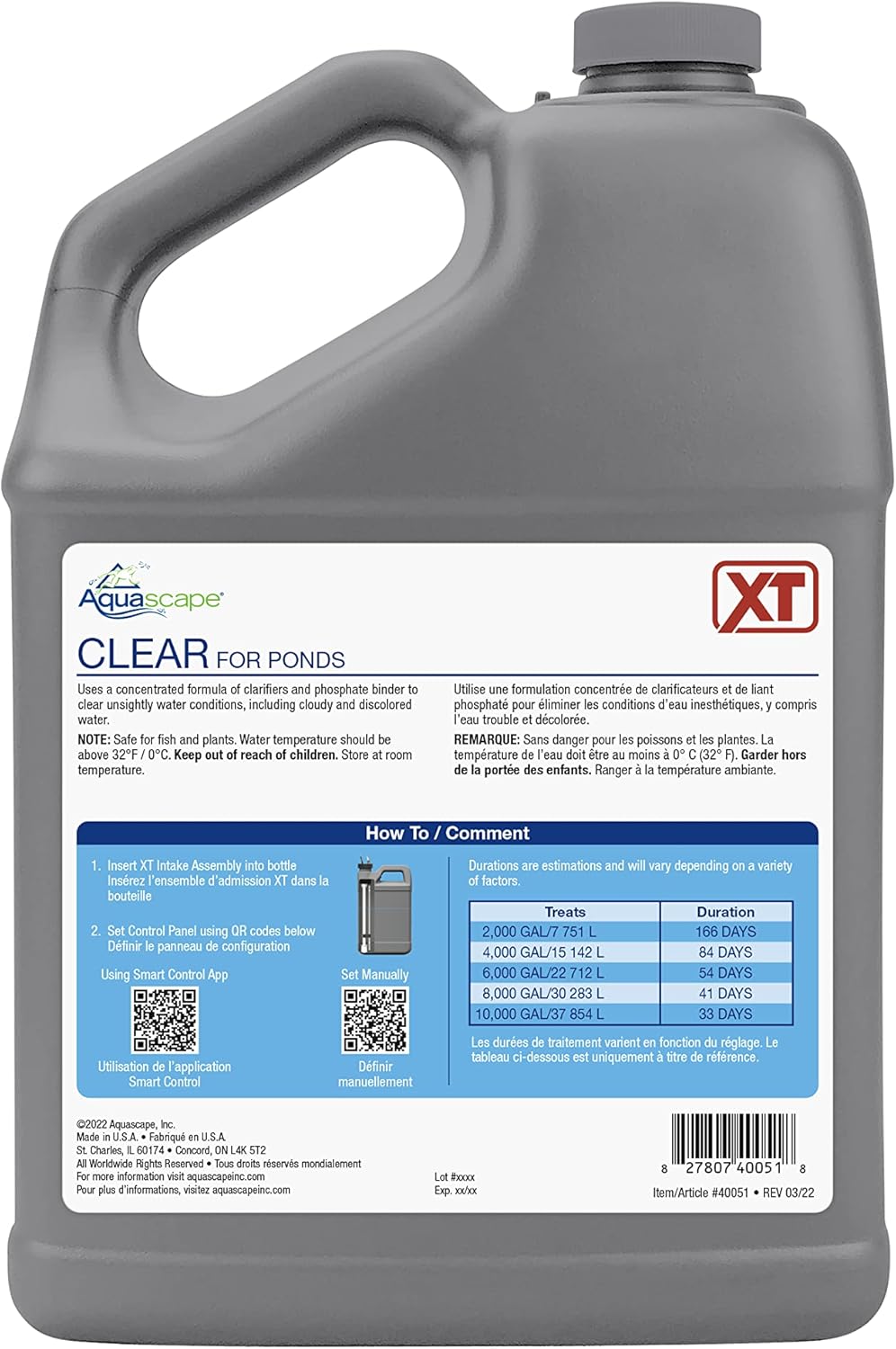 Clear for Ponds is the #1 problem-solving water treatment for ponds. Aquascape Clear for Ponds XT contains a concentrated formulation of ingredients designed to eliminate unsightly water conditions, solving even the most stubborn water quality problems. Clear for Ponds XT is available in half gallon and gallon options and designed only for use with the Smart Pond Dosing System XT. The specialized formulation contains a blend of clarifiers designed to clear cloudy or discolored water and reduce debris that attaches to rocks and gravel. Clear for Ponds XT also contains a powerful phosphate binder to lock up excess nutrients that may otherwise cause water quality problems. Clear for Ponds XT is safe for fish, plants, pets, and wildlife. Clear for Ponds XT is also available in an extra strength, triple-concentrated (3X) formula for use in larger ponds or for extending the duration between re-fills