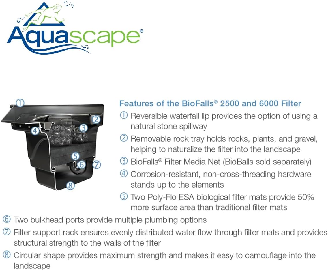 The Aquascape Signature Series 2500 Bio Falls Filter is ideal for use in ponds up to 2,500 gallons, providing efficient mechanical and biological filtration. Its durable, rotationally-molded, rounded polyethylene shape maximizes structural strength while making it easier to camouflage into your landscape. Able to handle flow rates up to 5,000 gallons per hour, The Aquascape Signature Series 2500 Bio Falls Filter includes our patented non-cross-threading screws and reversible 21.5 waterfall spillway lip, providing the option of installing a natural stone spillway. The included rock and plant tray can hold rocks, plants, and gravel, helping to naturalize the Bio Falls into the surrounding area. The Aquascape Signature Series 2500 Bio Falls Filter is easy to install and comes complete with fish safe silicone, hardware, dual 2 bulkhead, necessary fittings, media nets, and two Poly-Flo ESA Biological Filter Mats, providing 50% more surface area than traditional filter mats. Aquascape is passionate about ponds, water features and gardening, providing unique products, designs, and features that stand above the competition.