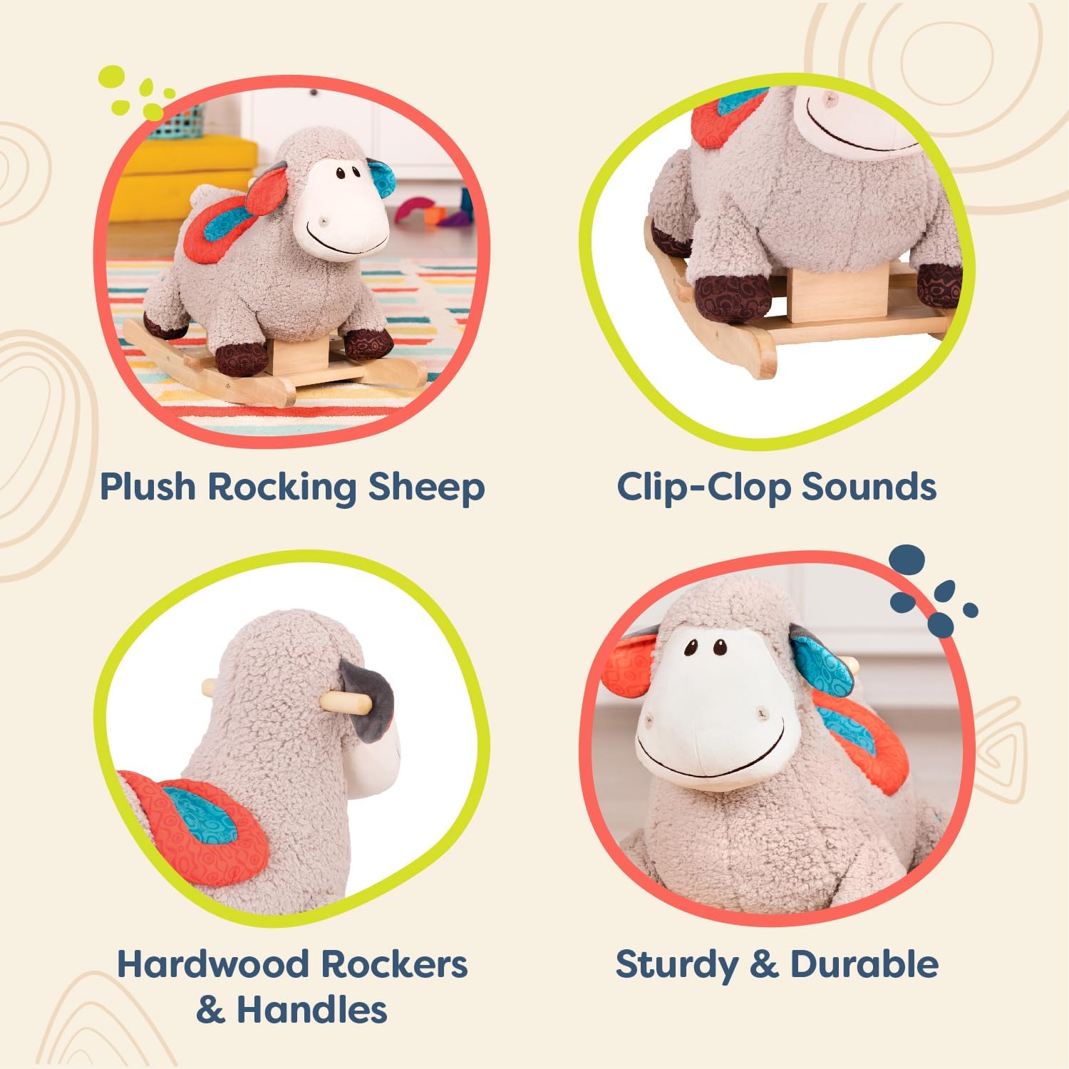 Hop on and take a ride on the Rodeo Rocker - Loopsy from B. toys! This plushy rocking sheep is a timeless playroom companion for toddlers to enjoy. Loopsy is equipped with natural hardwood handles and rockers that give this ride-on toy a classic feel. Settle into the comfy seat, listen to the clip-clop of this sheep's hooves, and turn on your imagination. Enjoy a day at the farm or explore the mountains! And because we at B. keep the environment in mind, parents will also be happy to know that our packaging is recyclable. Recommended for children 18 months and over.