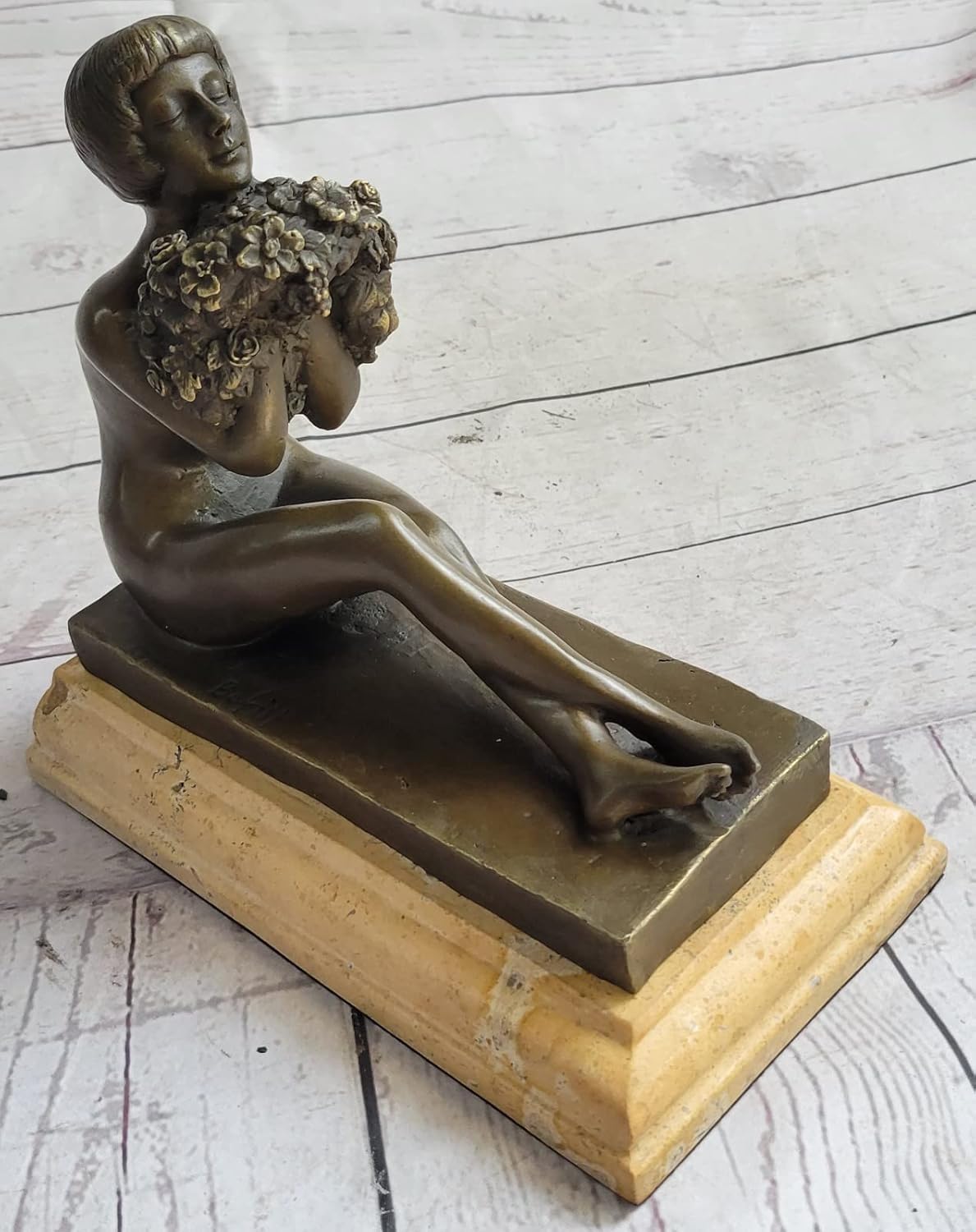This beautiful woman sits in the mist of a gorgeous flower garden and picked a bunch of different once for her home. She is semi nude, that reveals her legs. The beauty sits looking down to front to see if she spots anything else she might want to pick. Her hair is very short. She is sitting above a rock as she slowly tries not to fall. She is casted using the ancient old ""Lost Wax Method"" and is stained in brown patina finish for preservation. 100% handmade and 100% bronze, place atop a Beige marble base and signed by the artist BofillCondition; This sculpture is in perfect condition.Bronze Dimensions with Marble Base: Height 8.5"" x Width 8.5""Marble Dimensions: 8.5"" X 5""Height without base: 7.5""Weight :10 LBSInventory :67EP2556276
