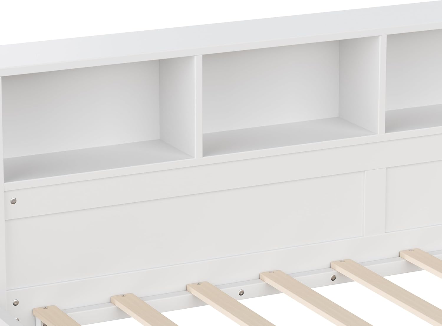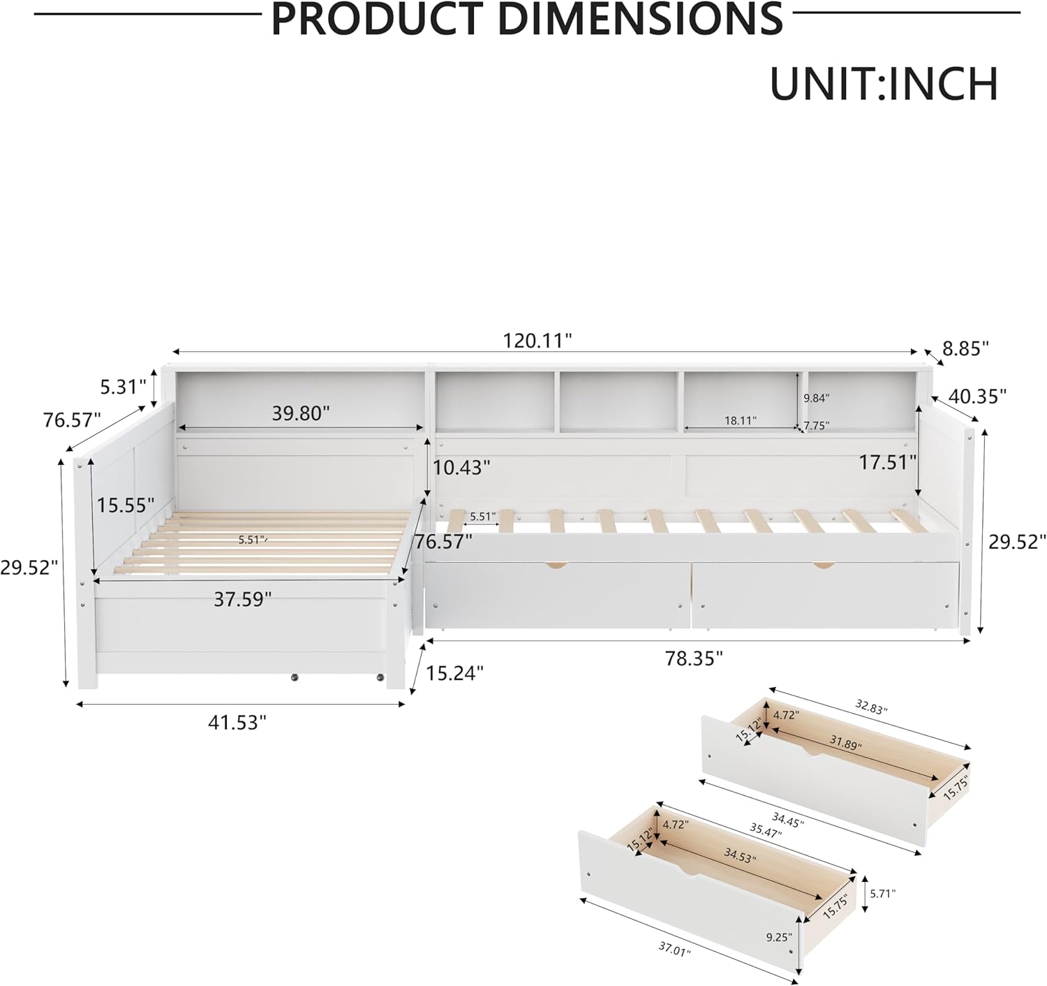 • [L Shaped Corner Bed with Bookshelf]This daybed features an integrated bookshelf that adds generous storage to your space. The shelf is divided into 5 sections, including 4 equal-sized compartments plus 1 extended compartment, giving you flexible room for items of different shapes and heights. Whether it’s books, decor, or daily essentials, everything can be neatly organized and easy to access, making your room feel both functional and visually balanced.