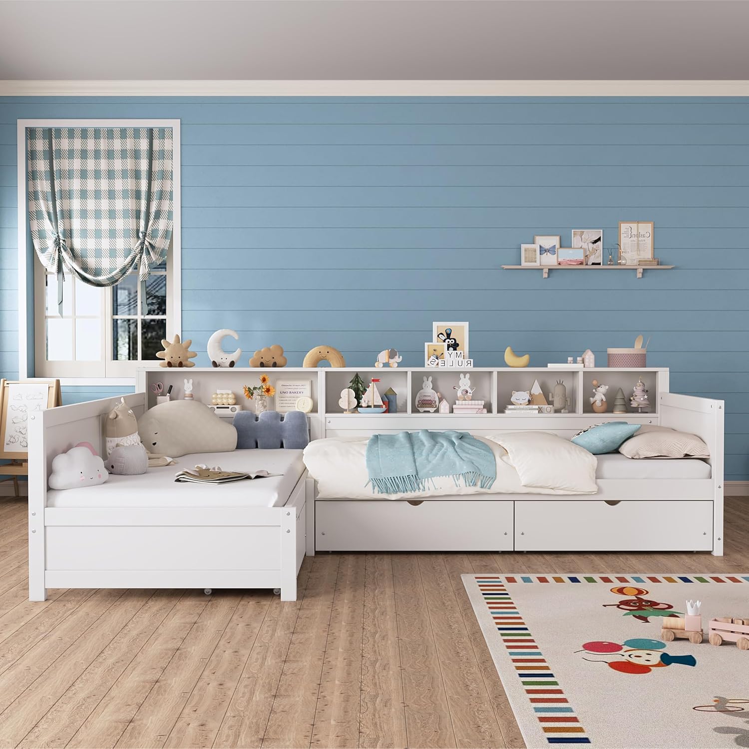 Bellemave L Shaped Corner Bed for 2 Kids, Double Twin Platform BedFrame with 3 Storage Drawers and Shelves, White