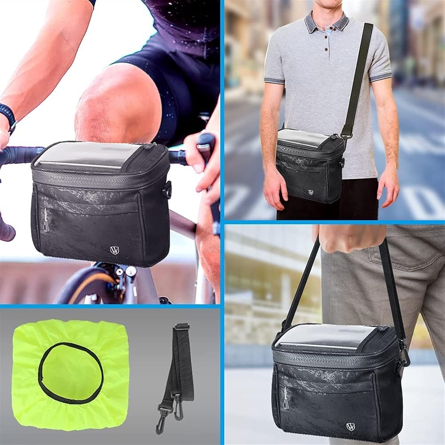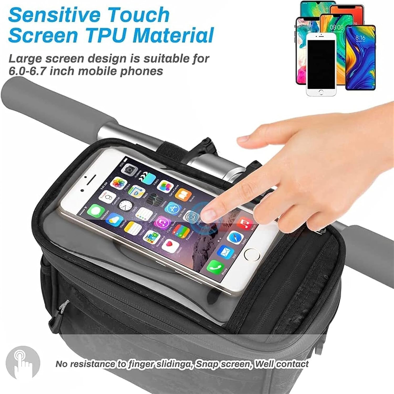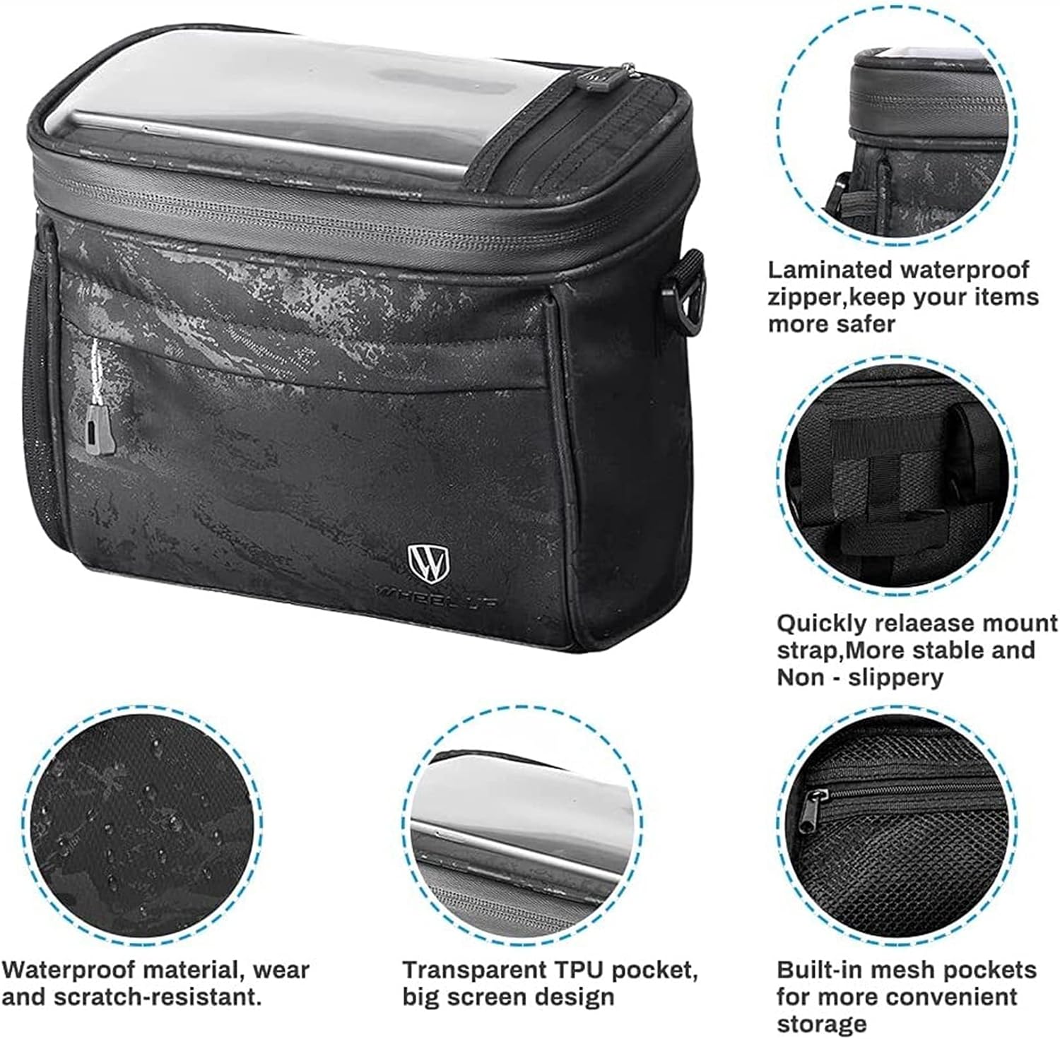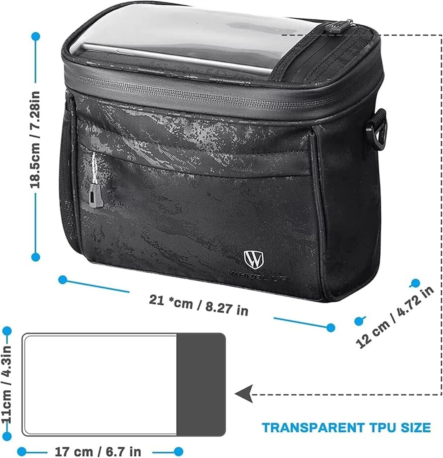 Features:Water Resistant Material - Water resistant polyester helps keep your items dry! High-quality waterproof zipper, durable and easy to clean.Easy on/off Hook &Loop Fastening Straps - No fiddling around with clips or buckles, simply attach, adjust &go!Universal Fit - Adjustable straps ensure it fits whatever the diameter of your handlebars &it stays put - does not move, shift or budge easily!4.2 Litre Main Storage Area - Pack as much or as little as you like.Mesh Pocket - Built-in mesh pockets on both sides can be used to carry equipment such as water bottles, pens, screwdrivers, chargers, towels, etc.Transparent - TPU sensitive cell phone case with touch screen, You can use your cell phone or GPS for precise navigation, answering calls, sending and receiving information, etc. every time.Detachable Shoulder Strap - Creates a lightweight shoulder bag or handbag so you can take your valuables with you.Specifications:Item: Bicycle Handlebar BasketColor: Black patternMaterial: PVC waterproof material+ TPUSize: 21 * 12 * 18.5cm / 8.27 * 4.72 * 7.28inTransparent TPU film: 17 * 11cm / 6.7 * 4.3inApplication: Work, Travel, Commute, Leisure etc.Suitable bicycles: Folding bikes, Road bikes, Mountain bikes etc.