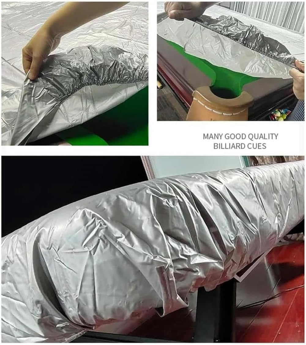 Premium Pool Table Cover – Optimal Schutz für Ihr BillardtischSchützen Sie Ihren wertvollen Pooltisch mit unserem hochwertigen Billardtischbezug. Hergestellt aus langlebigem PVC-Material, ist dieser Bezug sowohl wasserdicht als auch staubdicht, ideal für den dauerhaften Gebrauch. Ein perfektes Geschenk für Billiardliebhaber!Hauptmerkmale:Umfassender Schutz: Bietet vollständige Abdeckung für Ihren Tisch.Einfache Installation: Mit Zugkordel für eine optimale Passform.Leichte Reinigung: Einfach abspülen oder in kaltem Wasser einweichen und trocknen lassen.Widerstandsfähigkeit: Hervorragender Schutz vor Wasser, Wind, Schnee, Staub, Sonnenlicht und Rissen – hält Ihren Pooltisch sauber und sicher.Vielseitig einsetzbar:Nicht nur für Billardtische geeignet, sondern auch ideal für andere Spieltische wie Tischtennis oder Airhockey sowie für Gartenmöbel und Außentische.Spezifikationen:Material: PVCFarbe: SilberTypen: 7/8/9ft (Schwarz für Billardtisch), 10/12ft (Snookertisch)Größen:7ft: 2,4 x 1,3 m8ft: 2,6 x 1,4 m9ft: 2,9 x 1,6 m10ft: 3,3 x 1,9 m12ft: 3,85 x 2,1 mLieferumfang:1 x Pool Table Cover