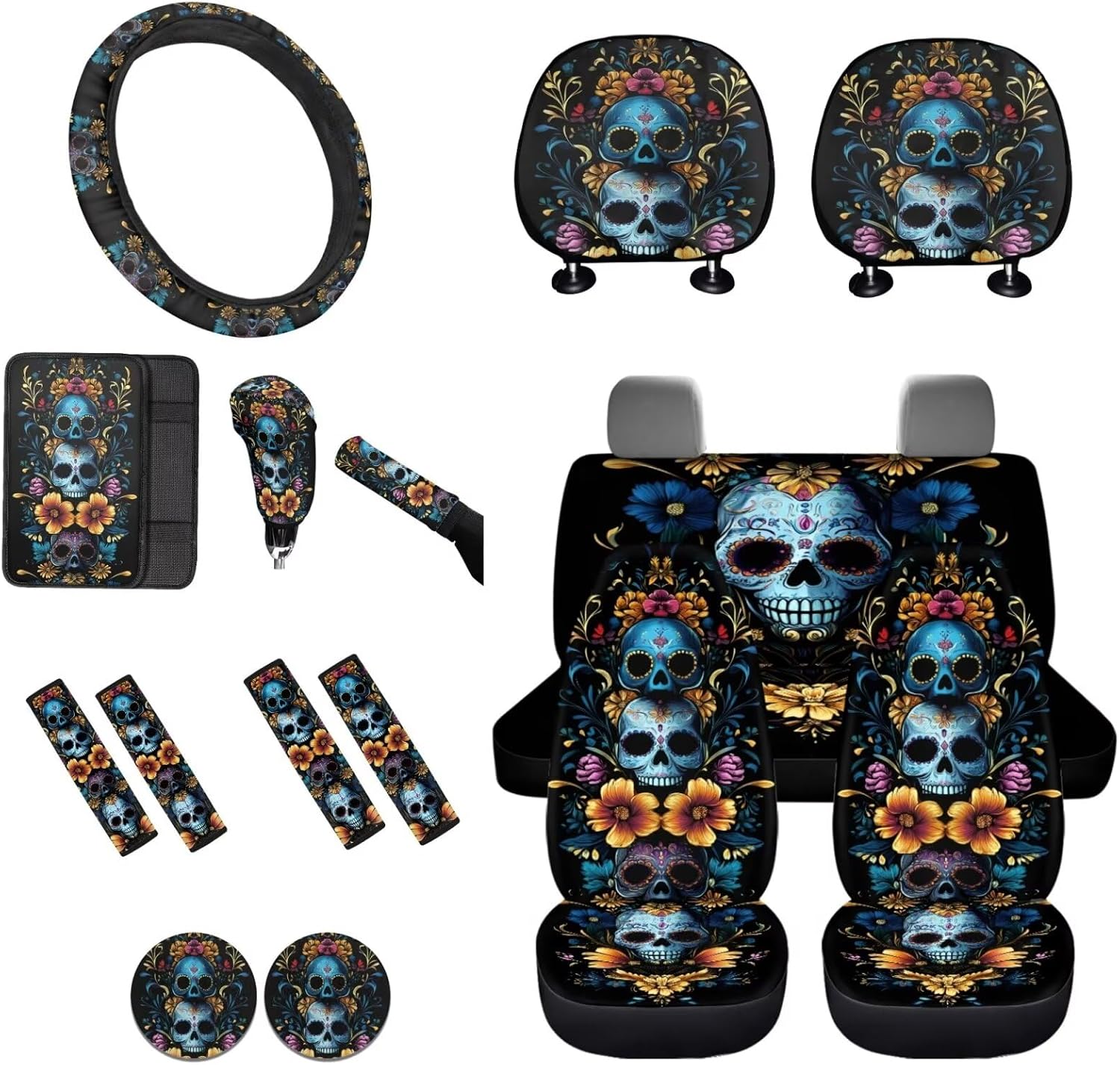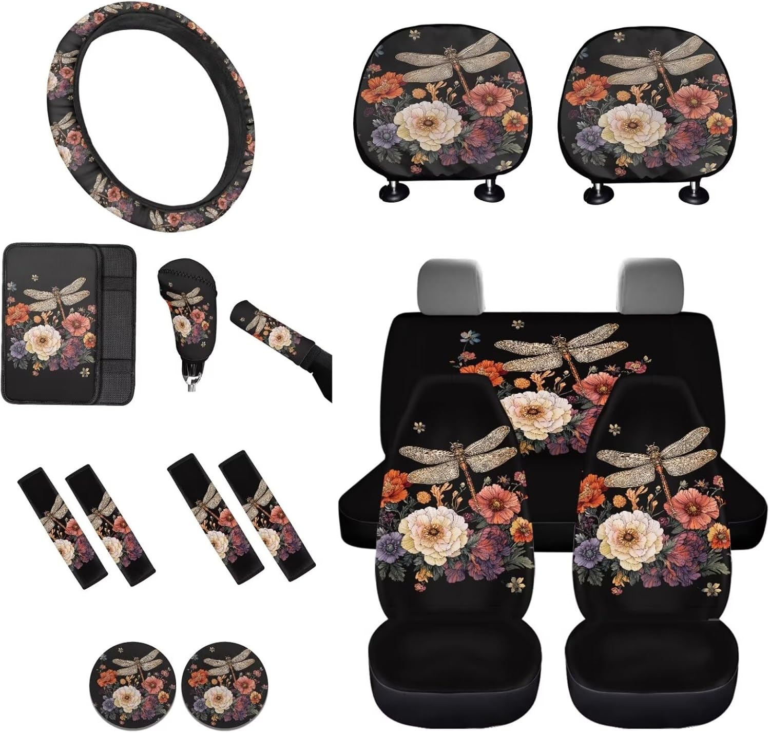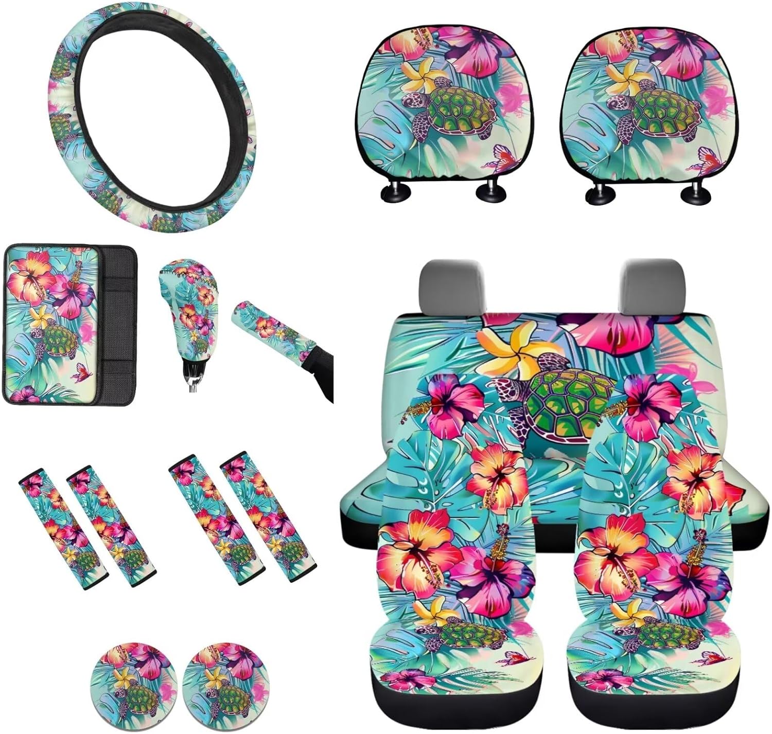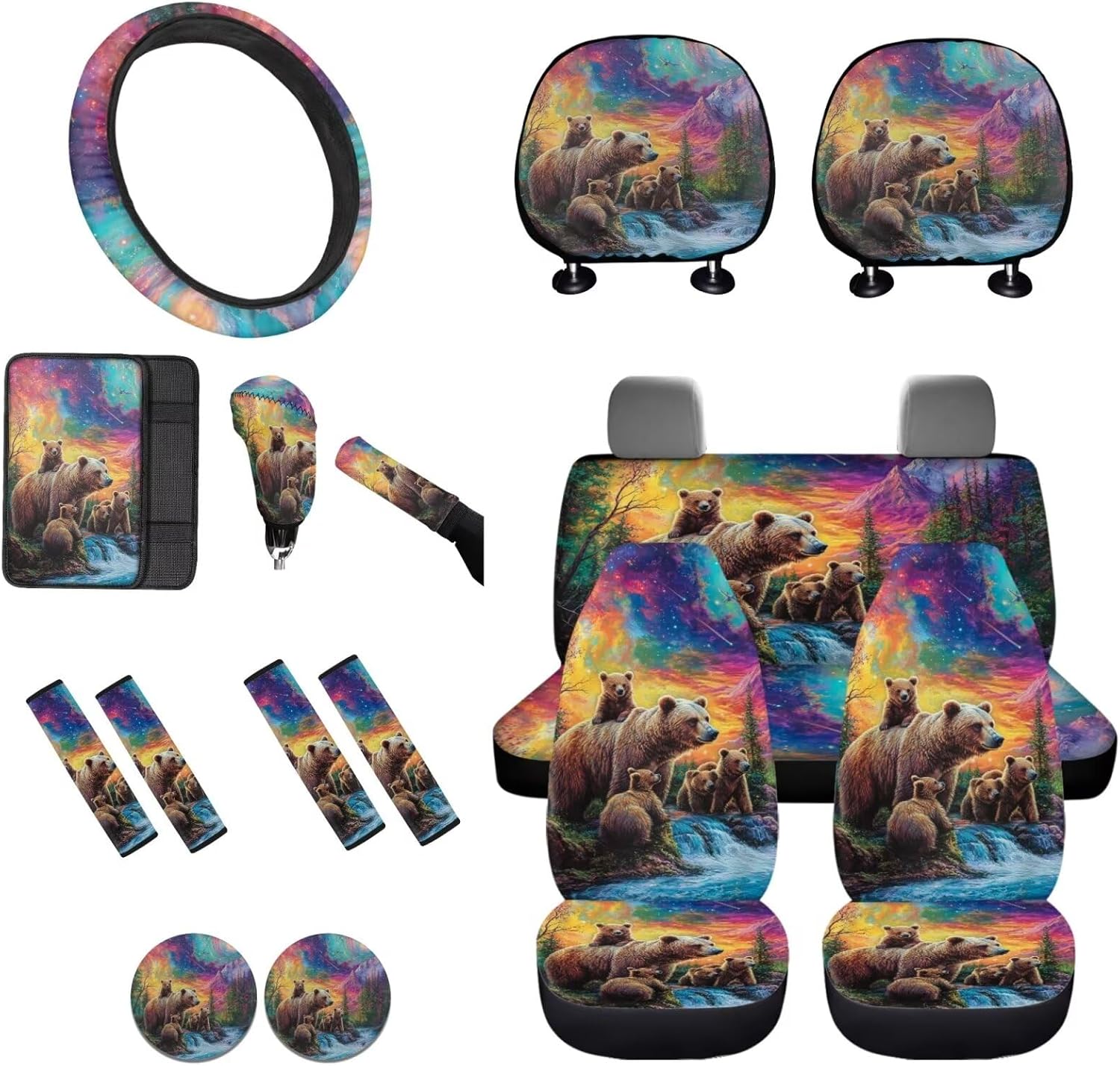 Easy to Install: These car accessories feature the personalized printing style, letting you and your guests enjoy your driving experience. Mounting this car accessories set is very easy, no complex procedures during your operation 16 Pieces in Total Package Includes: 2 front seat covers, 2 split rear seat cushions, 1 steering wheel cover, 4 seat belt covers, 1 center console armrest cover, 2 car headrests cover, 1 gear shift cover, 1 handbrake cover, and 2 car coasters Perfect Gift: We have a lot of patterns for your choice,and we provide customized services,so you can send us your favorite patterns.This multi patterned car seat cover full set will surprise your friends, mother and father. And it’s a perfect gift for Mother's Day, Father' Day, Thanksgiving Day, Halloween and Christmas Day, Independence Day, etc Tips: These car seat covers full set can be machine washed at a temperature not exceeding 45°C. Please do not soak for a long time and do not bleach. Note: Please allow for some color differences due to different lighting and measurement methods Additionally, please allow for a 1-3cm difference due to different measurement methods