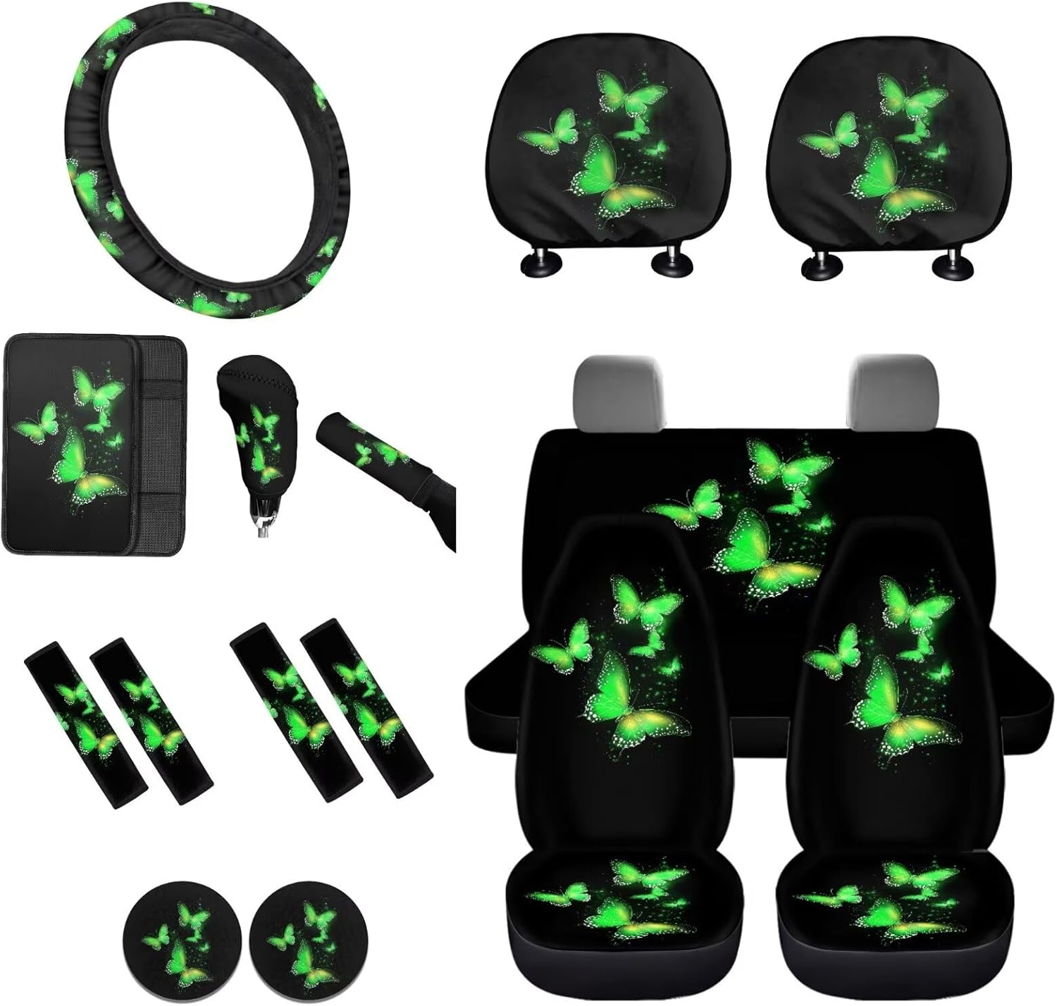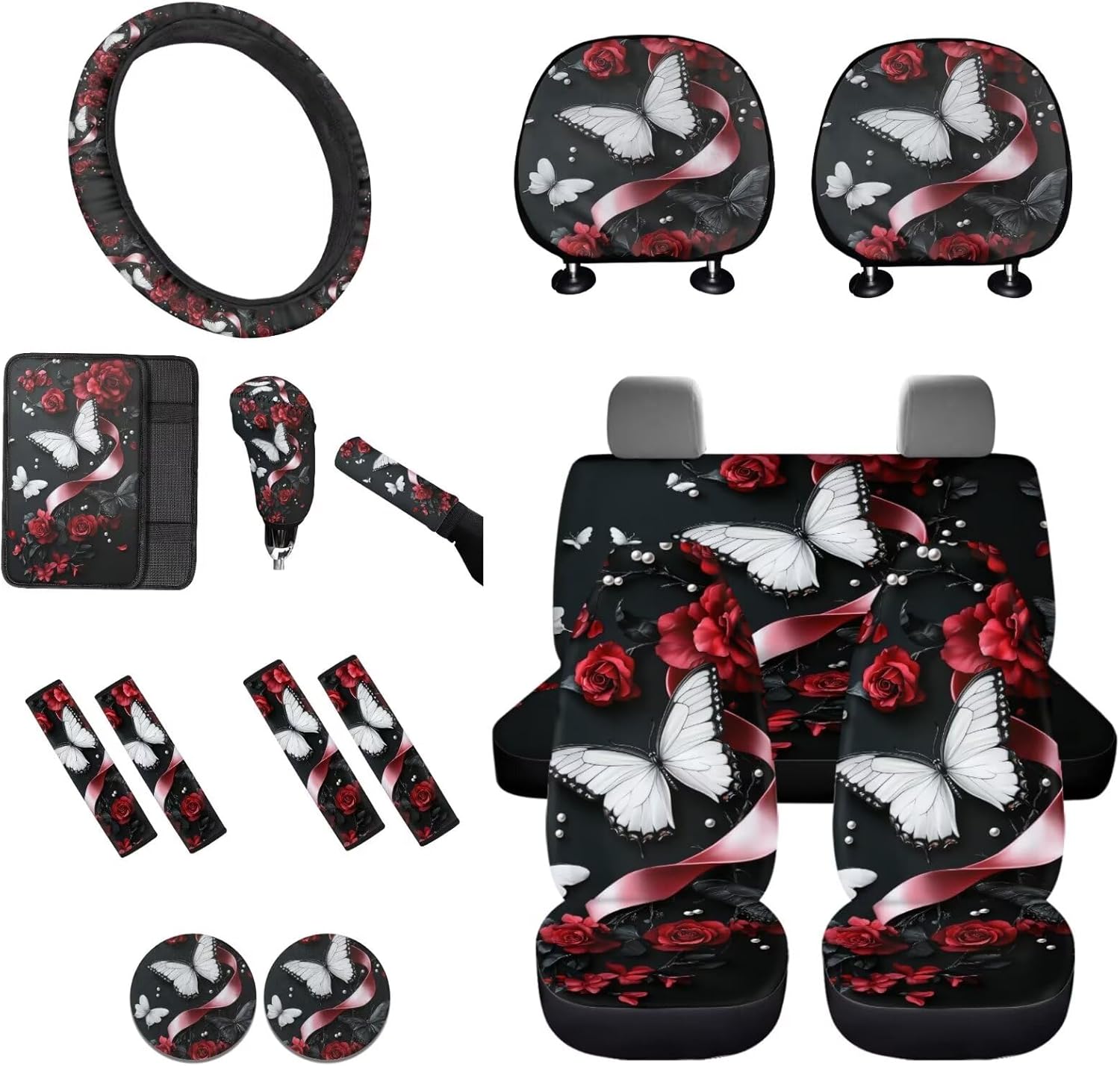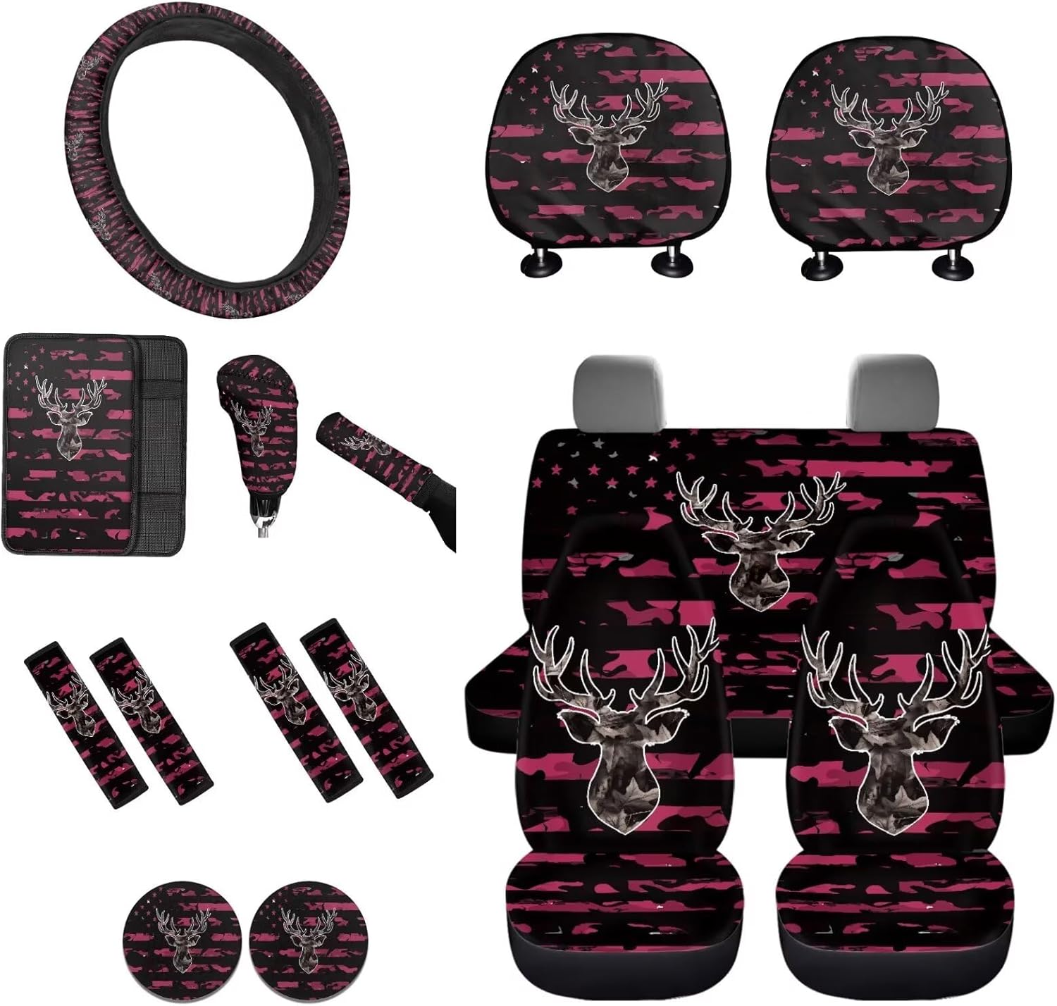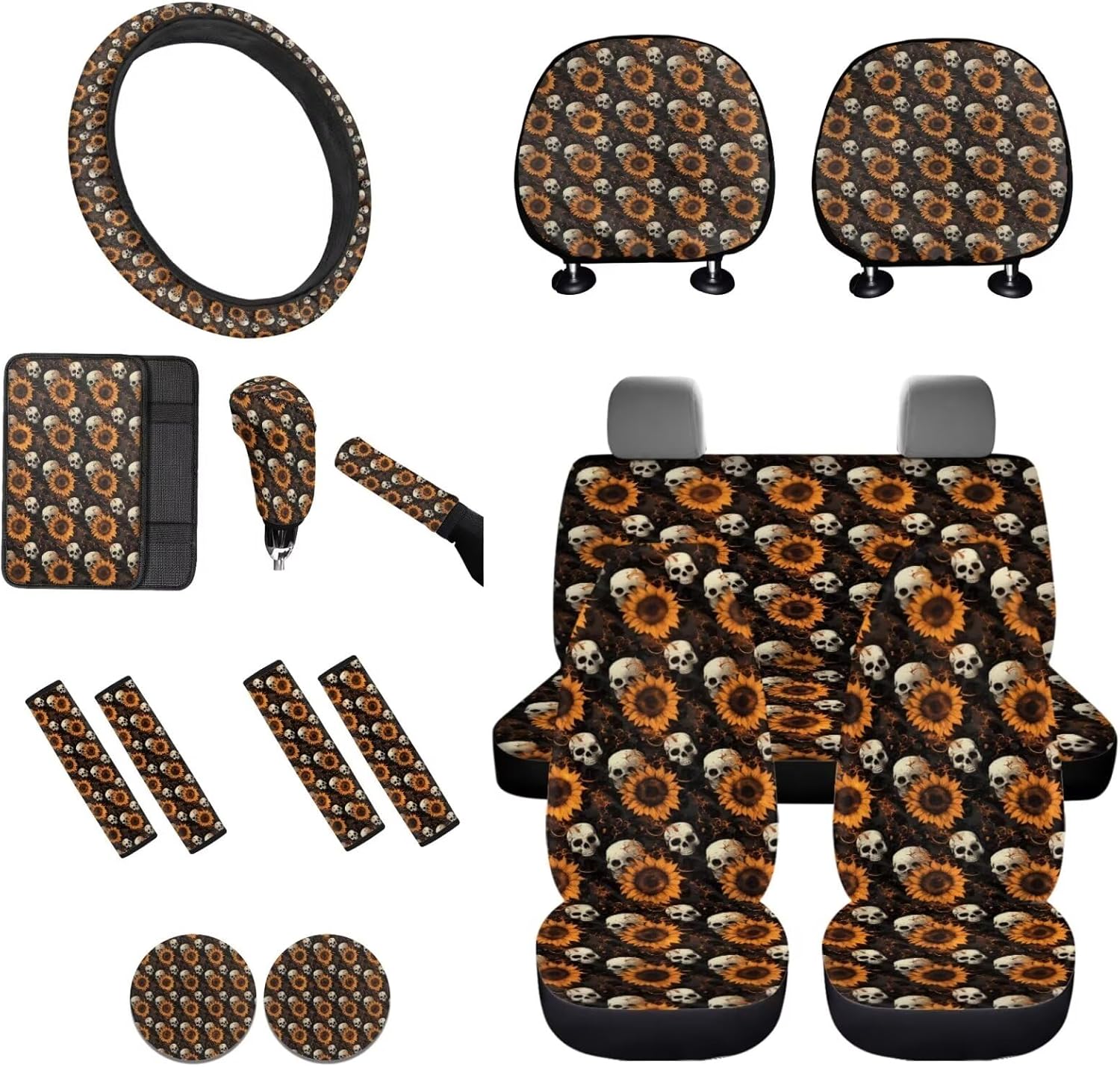 Easy to Install: These car accessories feature the personalized printing style, letting you and your guests enjoy your driving experience. Mounting this car accessories set is very easy, no complex procedures during your operation 16 Pieces in Total Package Includes: 2 front seat covers, 2 split rear seat cushions, 1 steering wheel cover, 4 seat belt covers, 1 center console armrest cover, 2 car headrests cover, 1 gear shift cover, 1 handbrake cover, and 2 car coasters Perfect Gift: We have a lot of patterns for your choice,and we provide customized services,so you can send us your favorite patterns.This multi patterned car seat cover full set will surprise your friends, mother and father. And it’s a perfect gift for Mother's Day, Father' Day, Thanksgiving Day, Halloween and Christmas Day, Independence Day, etc Tips: These car seat covers full set can be machine washed at a temperature not exceeding 45°C. Please do not soak for a long time and do not bleach. Note: Please allow for some color differences due to different lighting and measurement methods Additionally, please allow for a 1-3cm difference due to different measurement methods