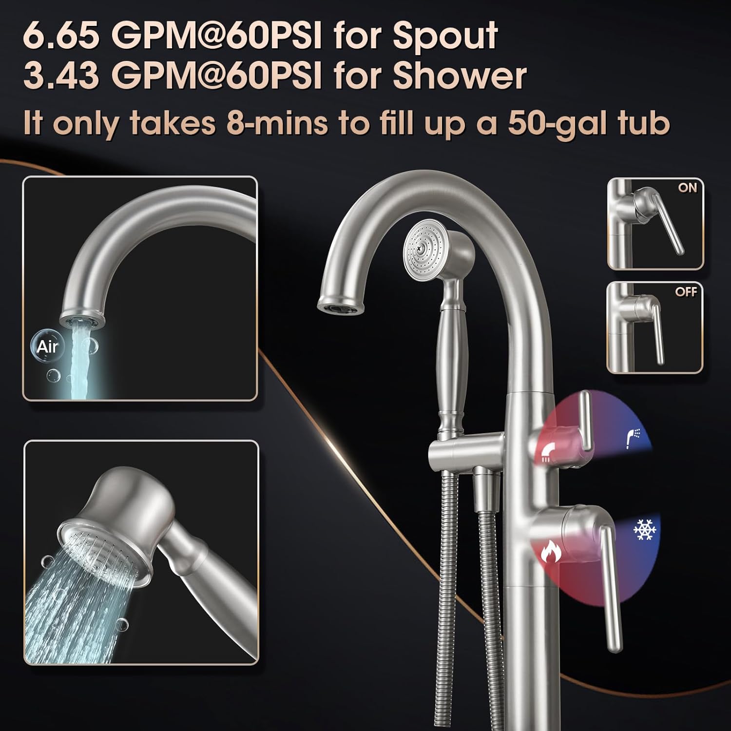 | Included Components | Main Faucet,Standing Tube,Hand Shower,Supply Hose,Shower Hose,Bracket,Escutcheon,Bolts,Screws,Hex Wrench,Allen Wrench,Installation Instructions,White Glove |