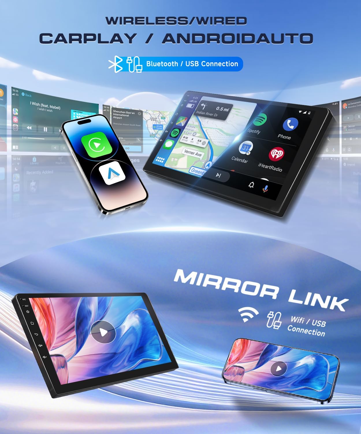 • 【Wireless & Wired CarPlay and Android Auto】Enjoy cable-free convenience with wireless CarPlay and Android Auto—no USB needed. Seamlessly access Maps, Music, and calls right from your car. Sync apps like GPS Maps, Spotify, and iTunes to keep your data and content flowing smoothly on every drive