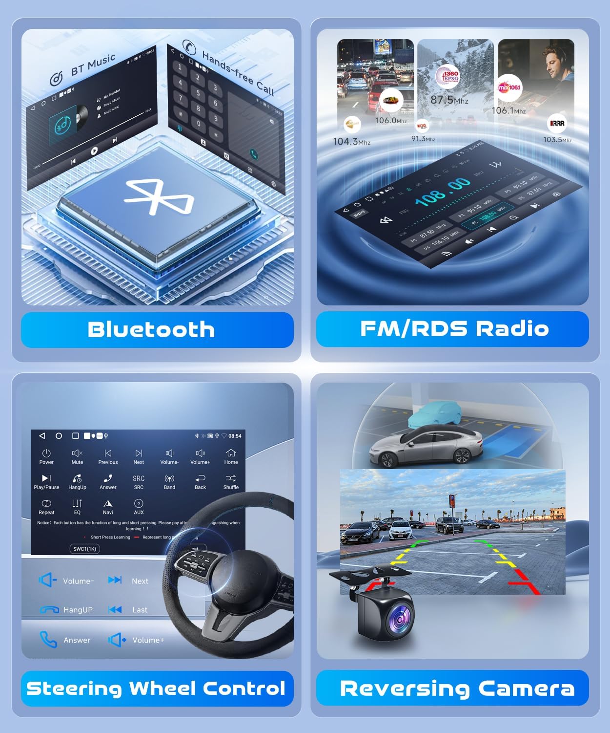 • 【Additional Key Features】Android system with 2GB RAM + 32GB ROM for smooth, responsive performance. Car stereo with bluetooth for hands-free calls & music, plus FM/RDS radio, steering wheel control, wired/wireless mirror link, dual USB inputs, and support for file manager/dash cam
