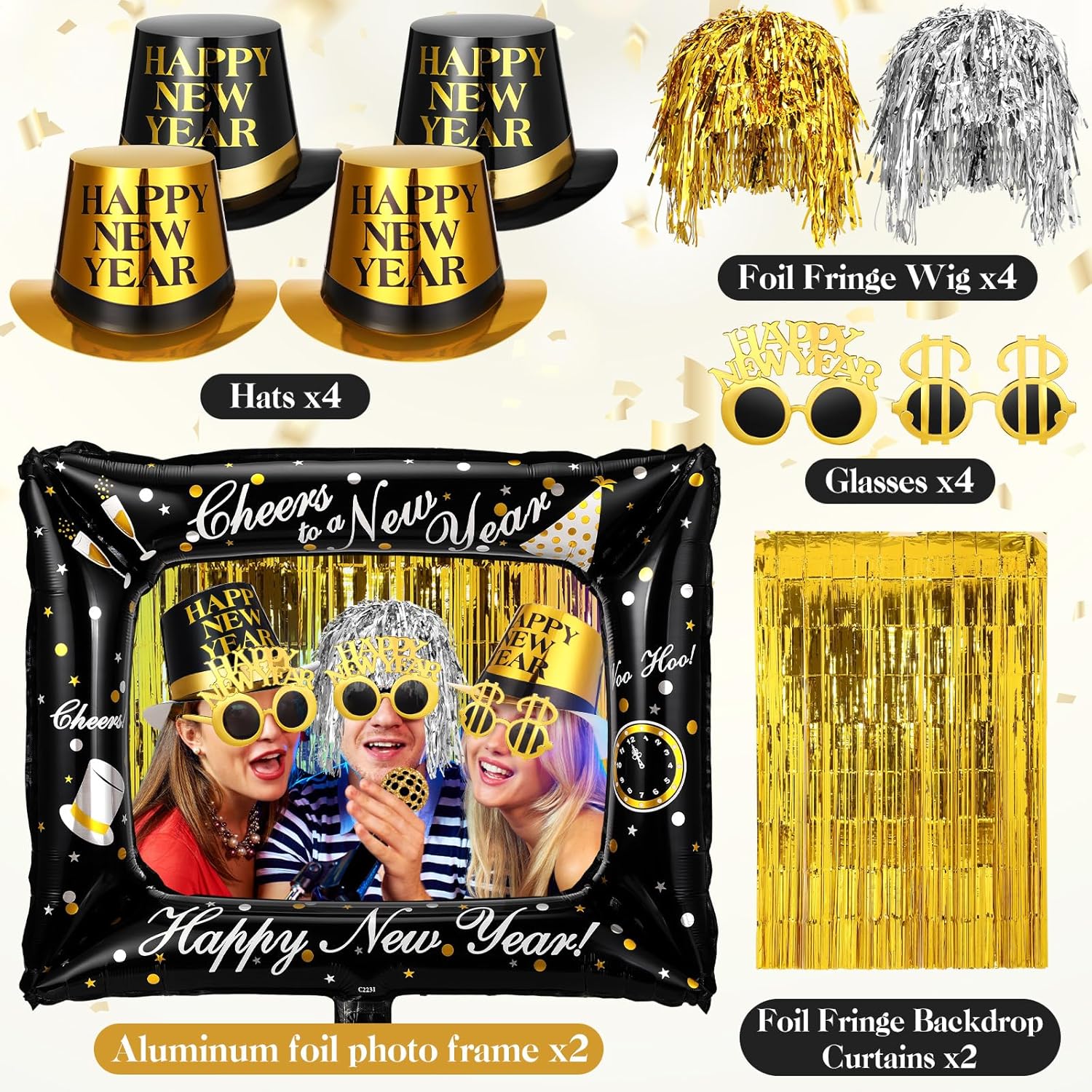 Please understand that in the picture are not included. Features: Whether it's a family gathering, dinner, or large celebration, this product meets your needs. By using this product, you can easily enhance the atmosphere of your party. The vibrant balloons and rain curtain wigs will bring a joyful vibe to your gathering, capturing the attention of most guest. Specifications: Balloon Material: latex Color: colorful Rain curtain size: 1 meter wide, 2 meter high Package includes: 4 x Hats 4 x Rain curtain wigs 1 x Pump 2 x New Year wine glass photo frames 2 x Rain curtains 4 x Glasses 12 x Balloons 50 x Photo props for 2026 party Notes: Manual measurement, please allow slight errors on size. The color may exist a slight difference due to different screen displays. Do not overinflate the balloons to avoid bursting