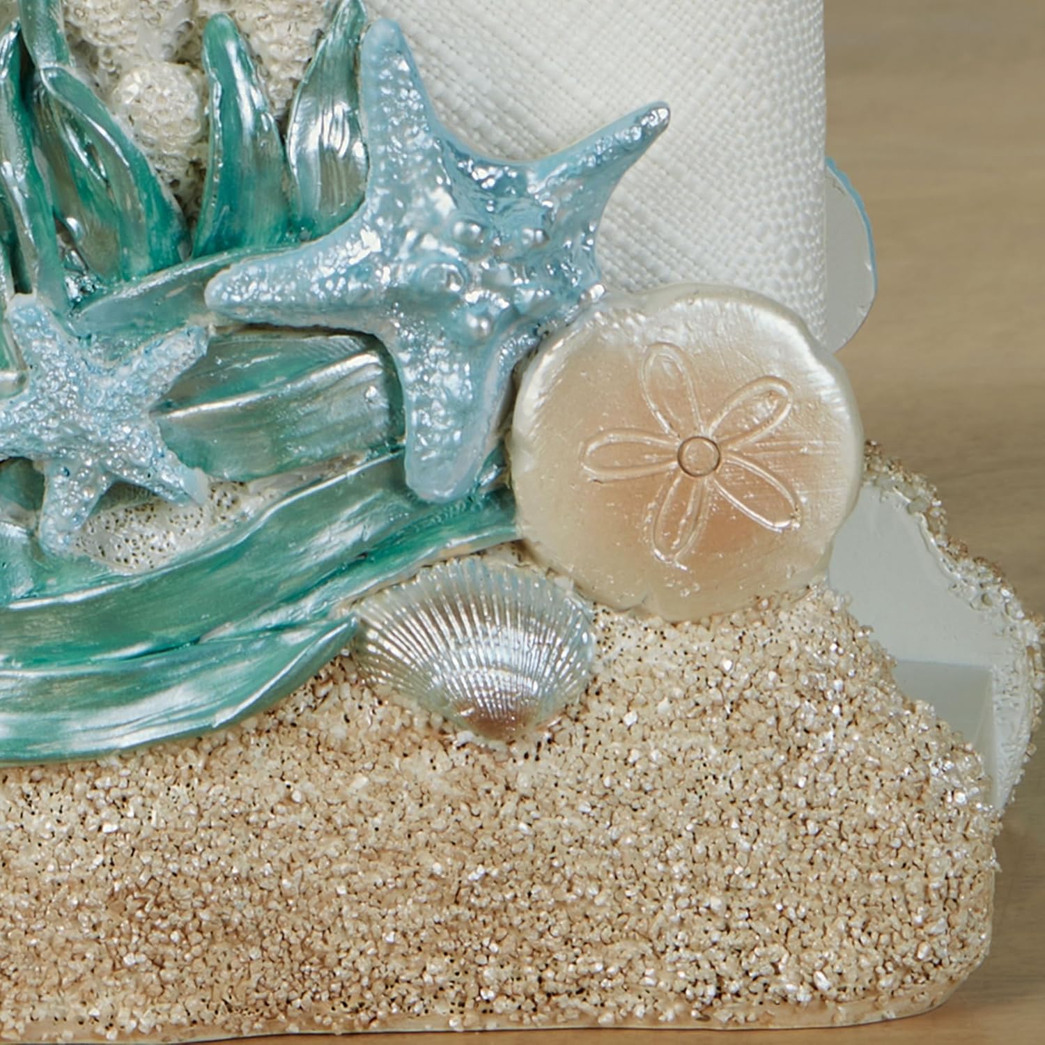 Catch a glimpse of where the Seahorse and sea turtle friends play. Handpainted in pearlescent cool hues, the coastal resin napkin holder features a sandy textured base, blue-washed sea horse, green sea turtle, green grasses, ivory textured coral, starfish, a sand dollar, and shells. The dual-sided design looks charming from any angle and holds your paper, cocktail, or fabric napkins in the 2" center space. Perfect for a gift or addition to your kitchen counter, dinner table, wine tasting space, bar cart, snack area, or beach house, the ocean-inspired tabletop napkin holder measures 9"Wx3.5"Dx7"H.