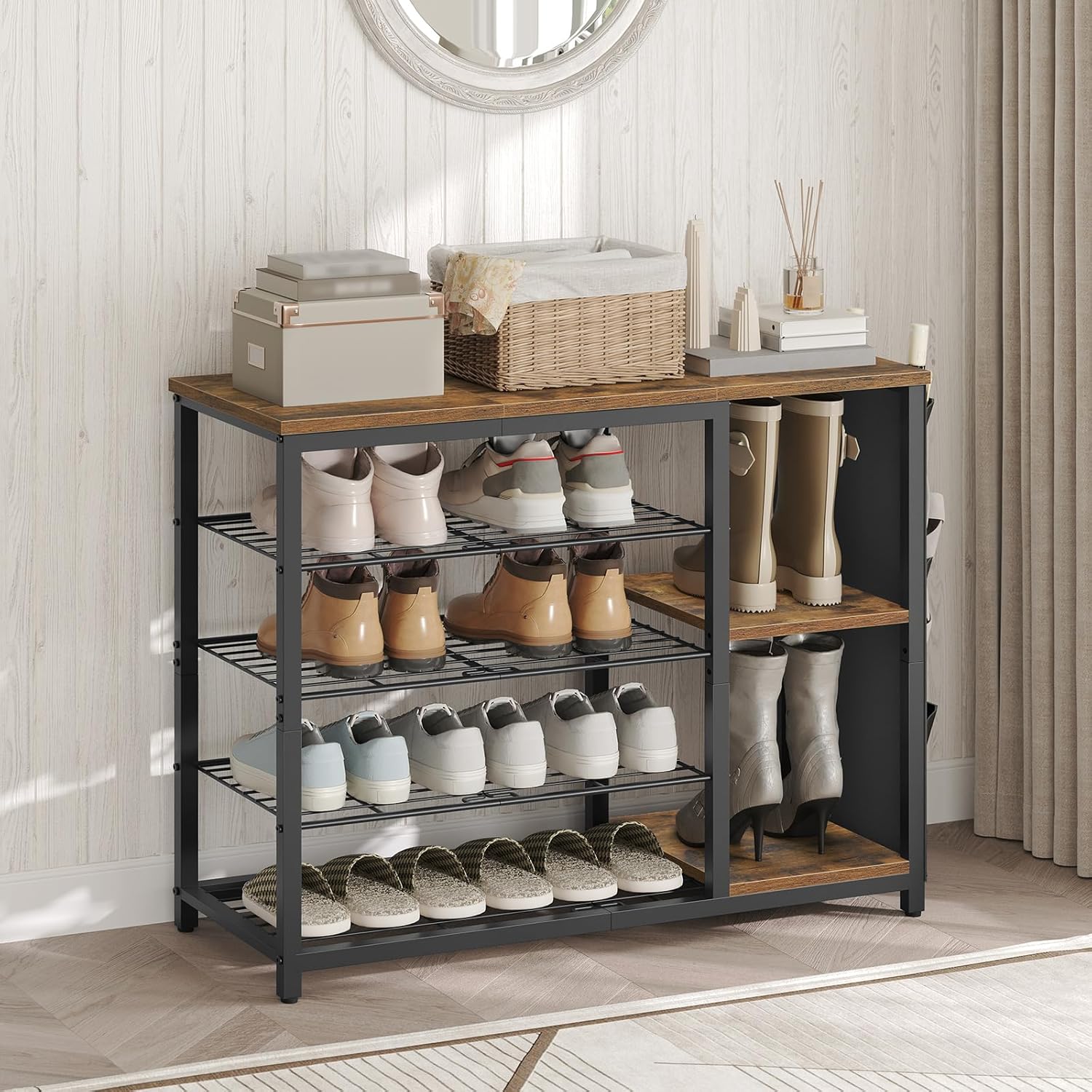 YATINEY Coat Rack Shoe Bench, 4-in-1 Hall Tree with Storage Shelves and Hanging Rod, Entryway Storage Organizer with 8 Movable Hooks, Industrial 5-Tier Shoe Rack, Metal Shoe Storage Organizer with Side Oxford Pocket, Entryway Heavy Duty Shoe Shelf for Small Spaces, Entryway, Hallway, MT12BR-SS84BR