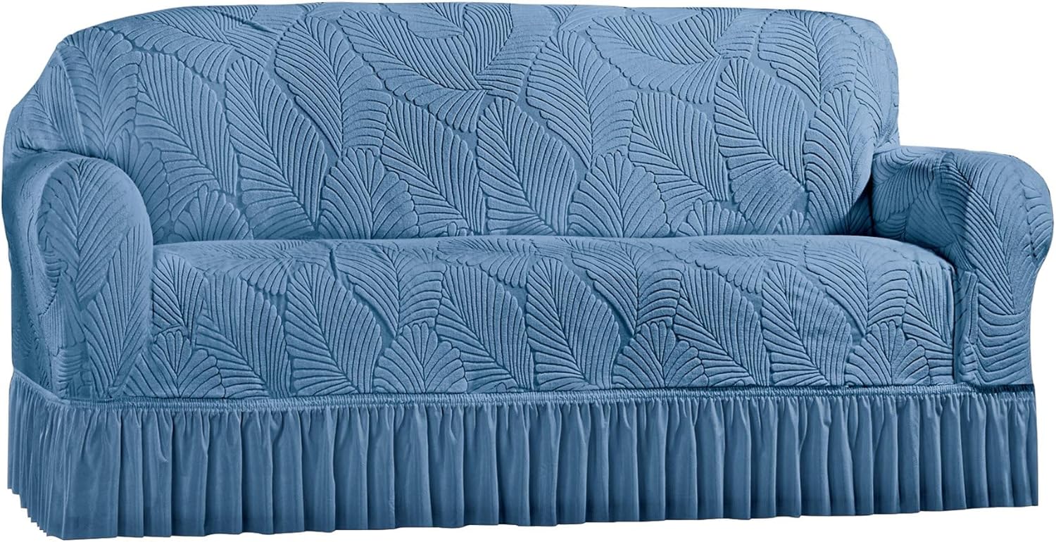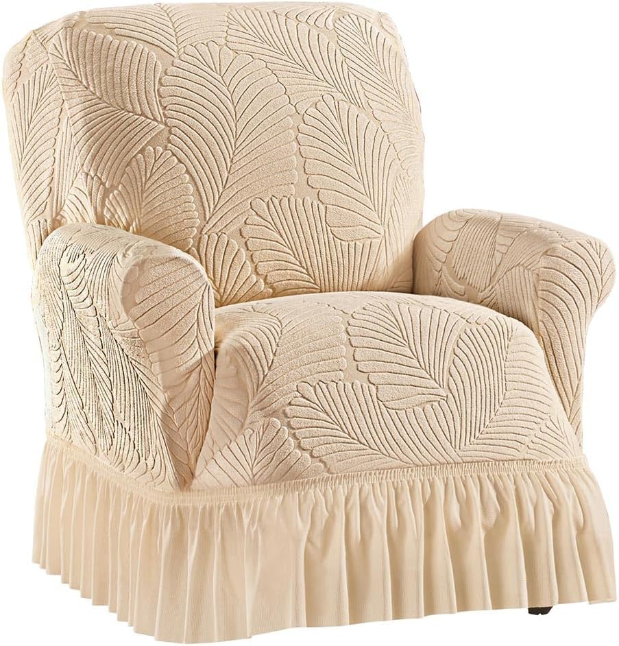 Textured Leaf Design Ruffled Skirt SlipcoverDescriptionThese fashionable, comfortable stretch slipcovers feature a textured leaf design and a ruffled skirt. Perfect for protecting your furniture from spills, wear and tear or for updating your décor, the covers tuck easily around your cushions for a custom fit. Machine wash. Polyester; imported. Choose: Taupe, Cream or Blue. Available in: Chair (fits 43"W arm to arm), Recliner (fits 43"W arm to arm), Loveseat (fits 72"W arm to arm) or Sofa (fits 90"W arm to arm).Material TypePolyester