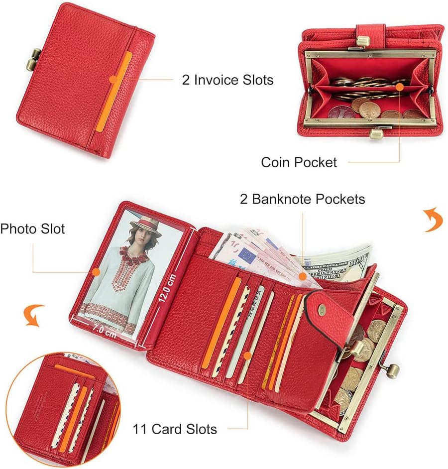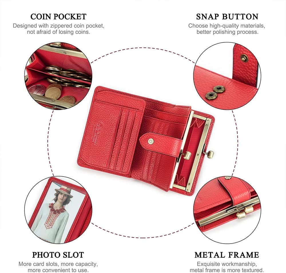 Feature: Main Material: Cowhide leather Function:RFID blocking Weight: 200g Color: Red Style: Minimalist, Fashion,Chic,Vintage Package included: 1 x Leather womens kisslock wallet