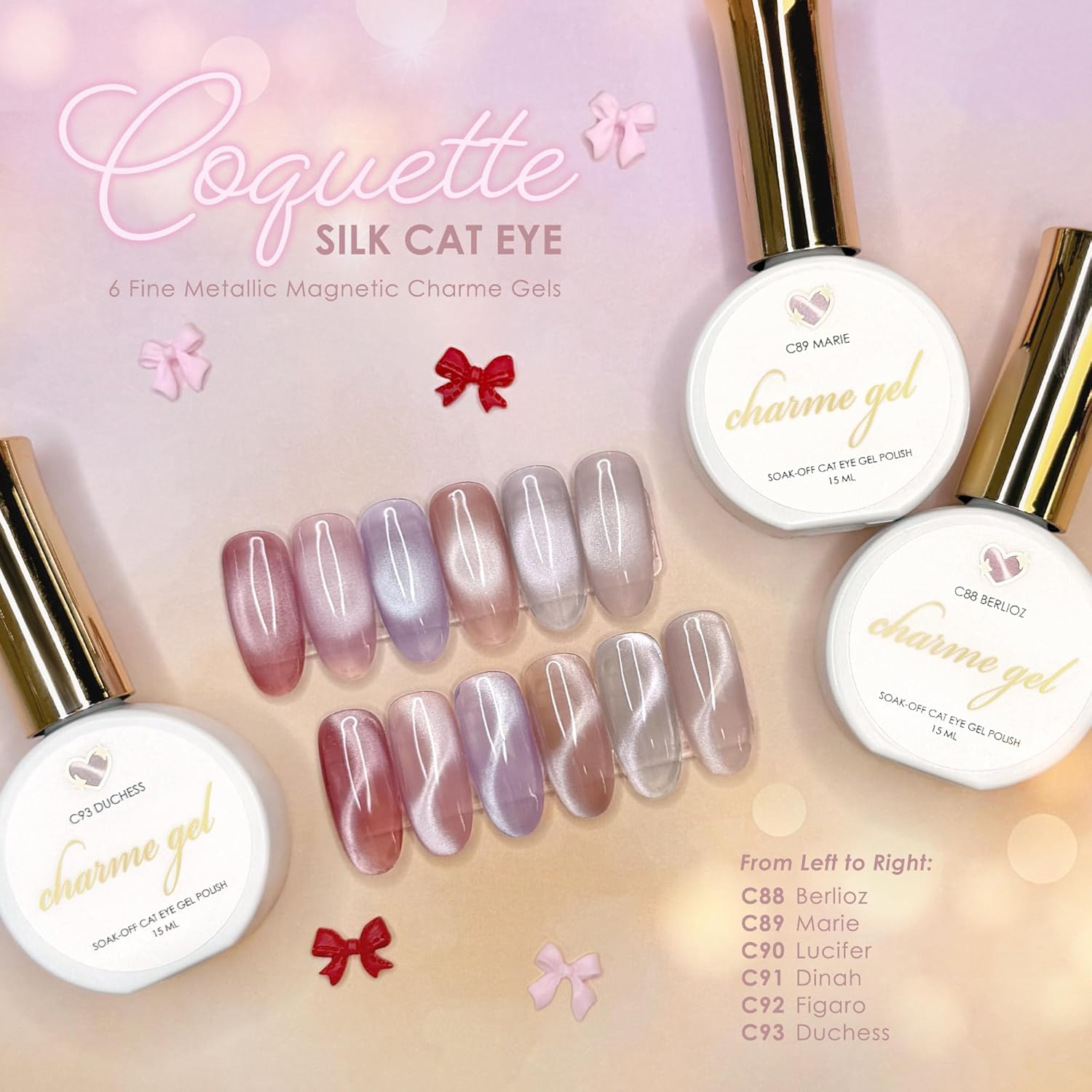 Introducing Charme Gel Coquette Silk Cat Eye Collection! The Coquette Silk Cat Eye Collection includes 6 luxurious satin cat eye gel polishes. Colors from the Coquette Silk Cat Eye Collection are made with ultra fine magnetic particles that give these gel polishes that extra brilliance. Pair these gorgeous silky cat eye polishes with any color, or wear it by itself and let your nails shine! Perfect for the balletcore and coquette aesthetic. Charme Gel Polish is a 3-step gel system that offers a highly pigmented, long lasting formula. It is gentle on natural nails with quick and easy soak off removal. Highly pigmented gel polish for smooth application. Easy soak off with acetone or gel remover. Up to 4 weeks wear time. Made in Taiwan.