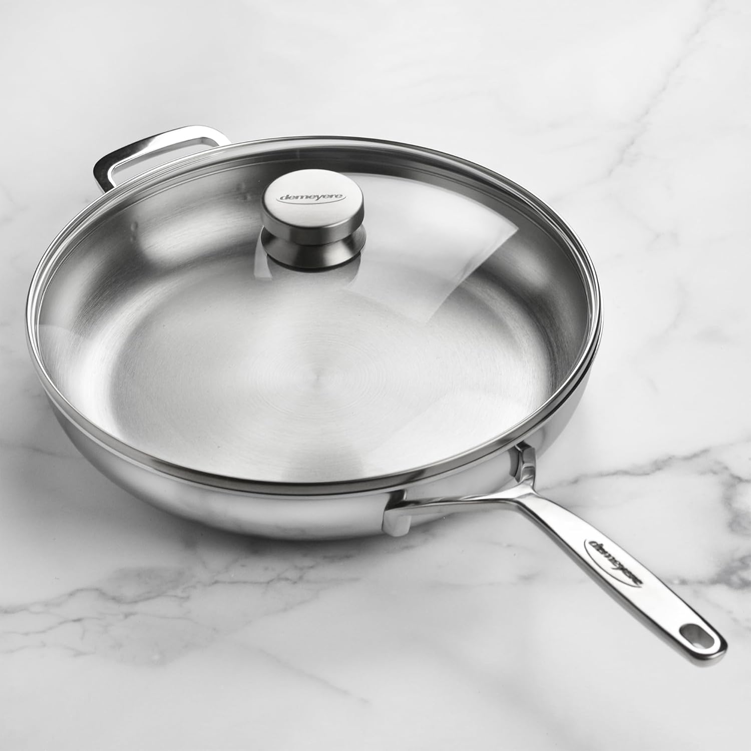 The Demeyere 5-Plus Stainless Steel Fry Pan with Glass Lid is perfect for preparing eggs and omelets as well as searing steaks, sauteing vegetables or browning potatoes and more. Demeyere 5-Plus is a premium cookware line featuring full clad 5-ply construction, stay cool handles, flat base stability and Silvinox finish, 5 Plus offers all of the features the home cook could ever need. The exclusive 5-Ply construction features a 3-layer aluminum core that ensures even heat distribution and a durable 18/10 stainless steel interior that won't react with food or discolor over time. Ideal for quick heating, outstanding searing, frying, and browning on any heat source, including induction. Demeyere's proprietary Silvinox finish is a unique system of electrochemical surface treatments that removes iron and impurities from the stainless steel. With the innovative Silvinox coating, the stainless steel exterior is easier to clean, resists discoloration under high heat, and is more fingerprint-resistant. Silvinox also ensures that the cookware will retain its silvery white appearance, even after many years of use. The flat, stable base will never bulge or warp when heated, ensuring even cooking. Oil evenly across the entire surface for superior results time after time. This is a distinctive feature compared to other cookware. The large, glossy 18/10 stainless steel handles are welded directly to each pan, not attached with screws or rivets. The stay-cool welded handles are more durable and more hygienic, preventing food and grease from accumulating, ensuring a firm, comfortable grip. Demeyere 5-Plus Cookware is designed to last a lifetime. They're the only pots and pans you'll ever need.