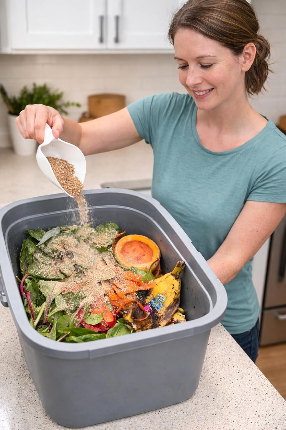 The easy snap sealed Bokashi Composter Kit is the first of its kind in the Bokashi compost market. All the other brands or models are with lids that requires strong force to open and close, which could tear apart the lids, whereas the snap sealed lid has a built-in silicon ring for complete seal in a quick snap. The VermiTek Bokashi compost kit is an indoor system for recycling food scraps into an organic compost. It uses enzyme to ferment the food scraps. It takes about 2 weeks to fill the compost bucket and another 2 to 3 weeks for the fermentation process. Then, the fermented food scraps can be buried into the soil, and turns into organic soil conditioner. When the ferment process goes successfully, it does not generate unpleasant smell. The Bokashi compost kit includes a piece of strainer, allowing the liquid separating from the main food scraps to ensure successful fermentation, a piece of spigot and a cup are provided to collect the liquid. This liquid contains rich nutrient and it can be used as a fertilizer. The liquid also contains enzyme which can be used to un-clog the house-hold drains. The compost kit comes with a piece of finger snap air-tight lid, which ensures anaerobic fermentation. The composting kit also comes with a piece of a dual functions tool: compactor/scraper. The compactor is for compressing the food scrap to squeeze out the air, and the scraper is for removing the fermented food scrapes from the buckets. This is new feature and the other Bokashi composting models don’t have this feature. A bag of 2.2 lbs of locally made Bokashi bran with a spoon is included in the compost kit. A piece of kitchen food scrap collection pail is included in the system to store the food scraps before transferring to the Bokashi bucket. The market value of the compost pail is worthy of $15.
