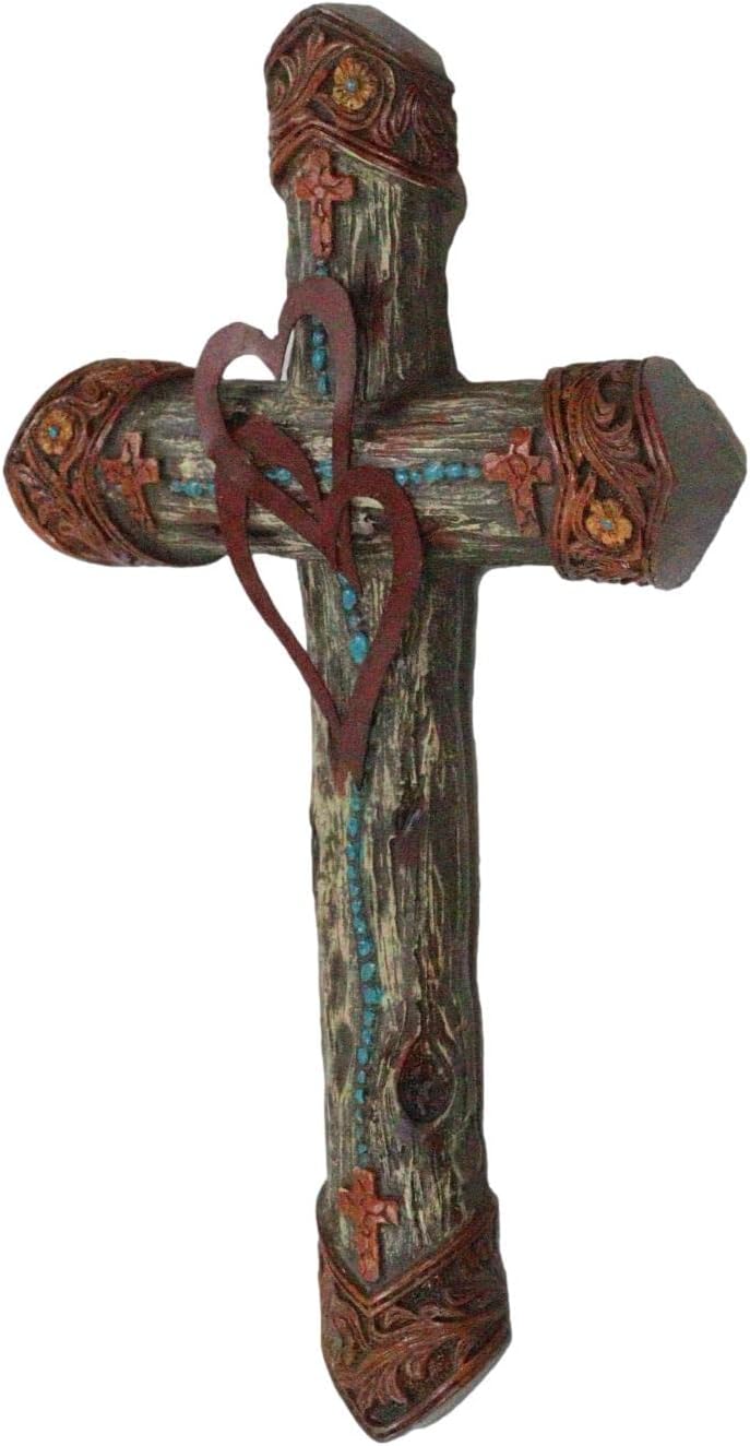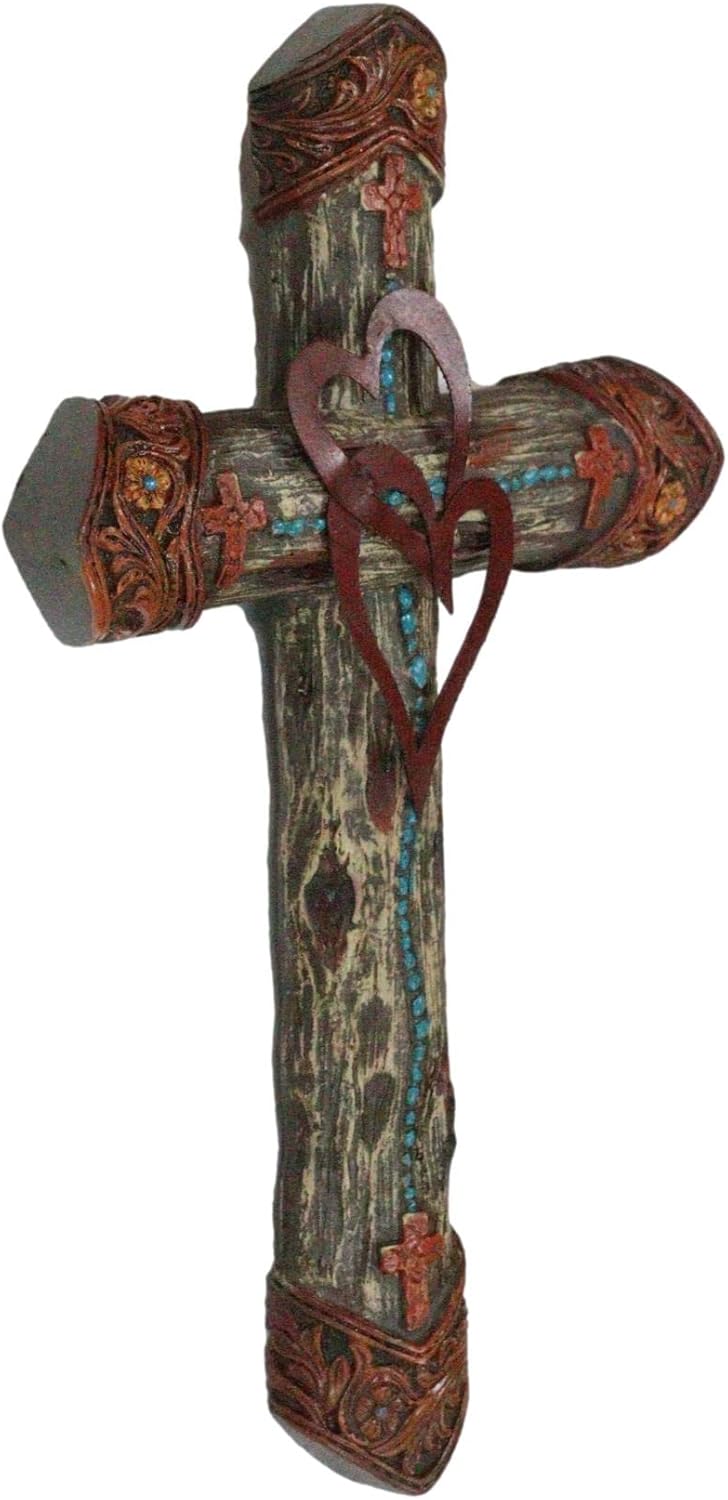 This faux wooden cross is suitable for decorating in the living room, studying room, bedroom, office, garden, or hanging at the position of the front door, back door, wall position near the entrance. Featuring faux natural tree like planks shaped as a cross, the ends are sculpted with tooled scrollwork and floral artwork. Two intertwined hearts are set at the center and turquoise beads add vibrant colors to the cross.
