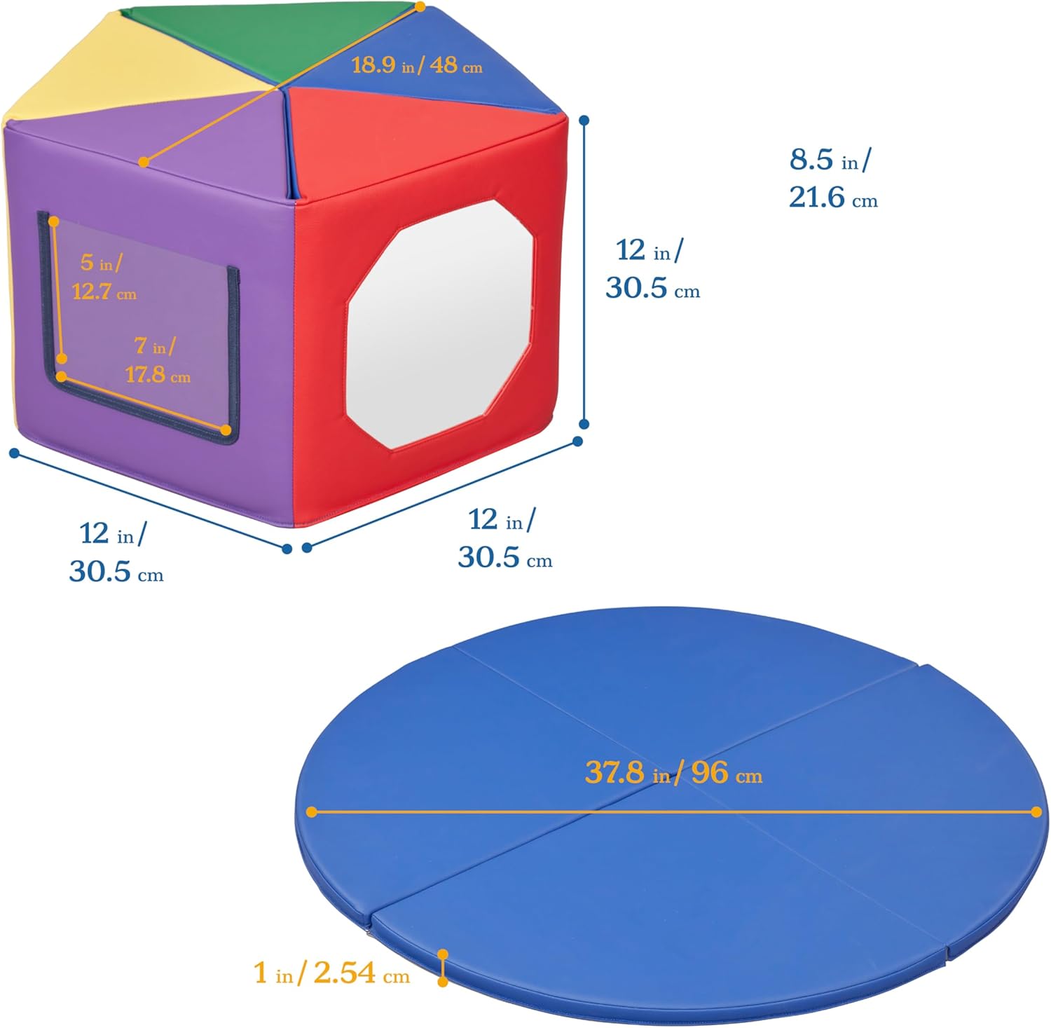 Spark your child’s curiosity with ECR4Kids SoftZone Wall of Mirrors. This versatile three-piece set includes a round activity mat and two pentagon shapes with shatter-resistant acrylic mirrors and clear pockets. The sensory activity is ideal for tummy time in a daycare, preschool, or home. When used as a mirror center, the padded enclosed design creates a safe space for babies to explore, promoting special awareness. Practice sitting up, reaching, and crawling for gross motor skill development. Roll up the pentagon shapes and secure them with the attached hook and loop extension to create two play spaces with mirrors and pockets facing outward. Mirrors encourage self-recognition and provide visual stimulation, helping babies develop self-awareness as they recognize their reflections over time. Clear 5x7 pockets allow for customization with family photos or learning materials. Seeing familiar faces supports emotional development and bonding and early educational materials like letters and shapes aid in early cognitive development. The foam core is covered in water-resistant polyurethane vegan leather with a durable woven backing and features a non-slip base for added stability. The baby activity center easily folds into compact pentagon shapes, and the 4-fold tummy time mat is perfect for space-saving storage.