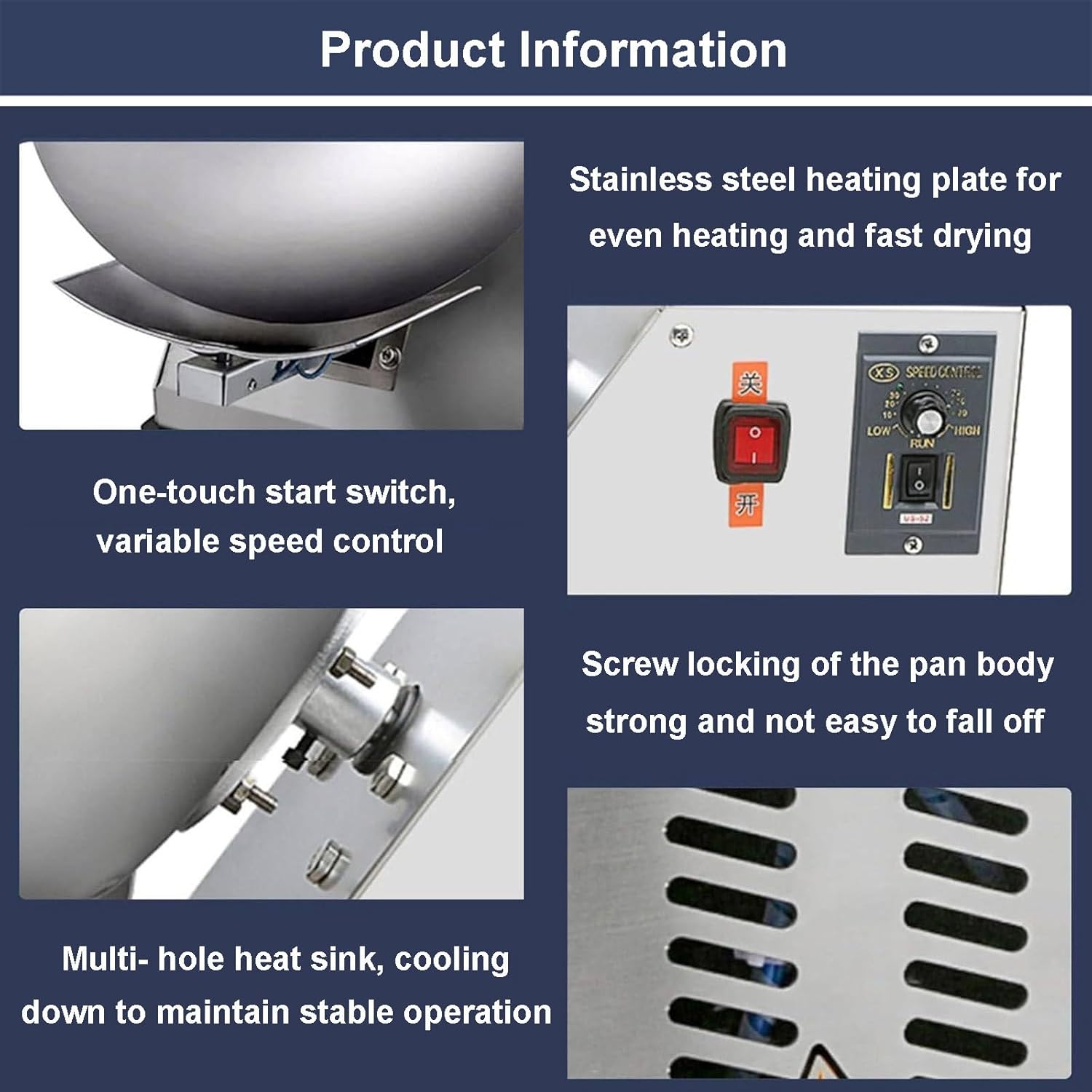 Welcome to my store. Our adjustable speed sugar coating machine is both easy to use and portable, with a pot diameter of 300mm. There are many different application scenarios, such as hotels, production facilities, food and beverage factories, farms, restaurants, home use, food shops, chocolate factories, etc. FEATURES: - Commercial candy machine with adjustable speeds with 2-5 kg/h capacity for small batch production - Electric candy polishing machine has 9 adjustable speeds, and the speed control range is 10-90 - Multi-hole heatsink, cooling to maintain stable use - Electrical use for easy use and consistent results in chocolate panning and sugar coating SPECIFICATIONS: Product Name: Sugar Coating Machine Material: stainless steel Rated power: 280 W External heating: 1000 W Pot Diameter: 300 MM/11.8 inch Machine output: 2-5 kg/hour Speed Control Range: 10-90 Machine size: 230 * 260 * 320mm/9 * 10.2 * 12.6 inch Product weight: 15 kg PACKAGE INCLUDED: 1* Chocolate Polisher 2* Gloves